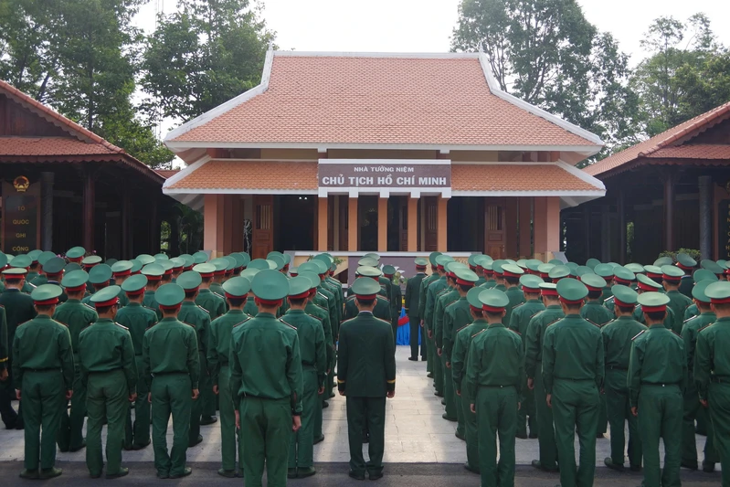 Cán bộ, chiến sĩ Sư đoàn nghiêm trang, kính cẩn trước Nhà tưởng niệm Chủ tịch Hồ Chí Minh trong khuôn viên Sư đoàn.