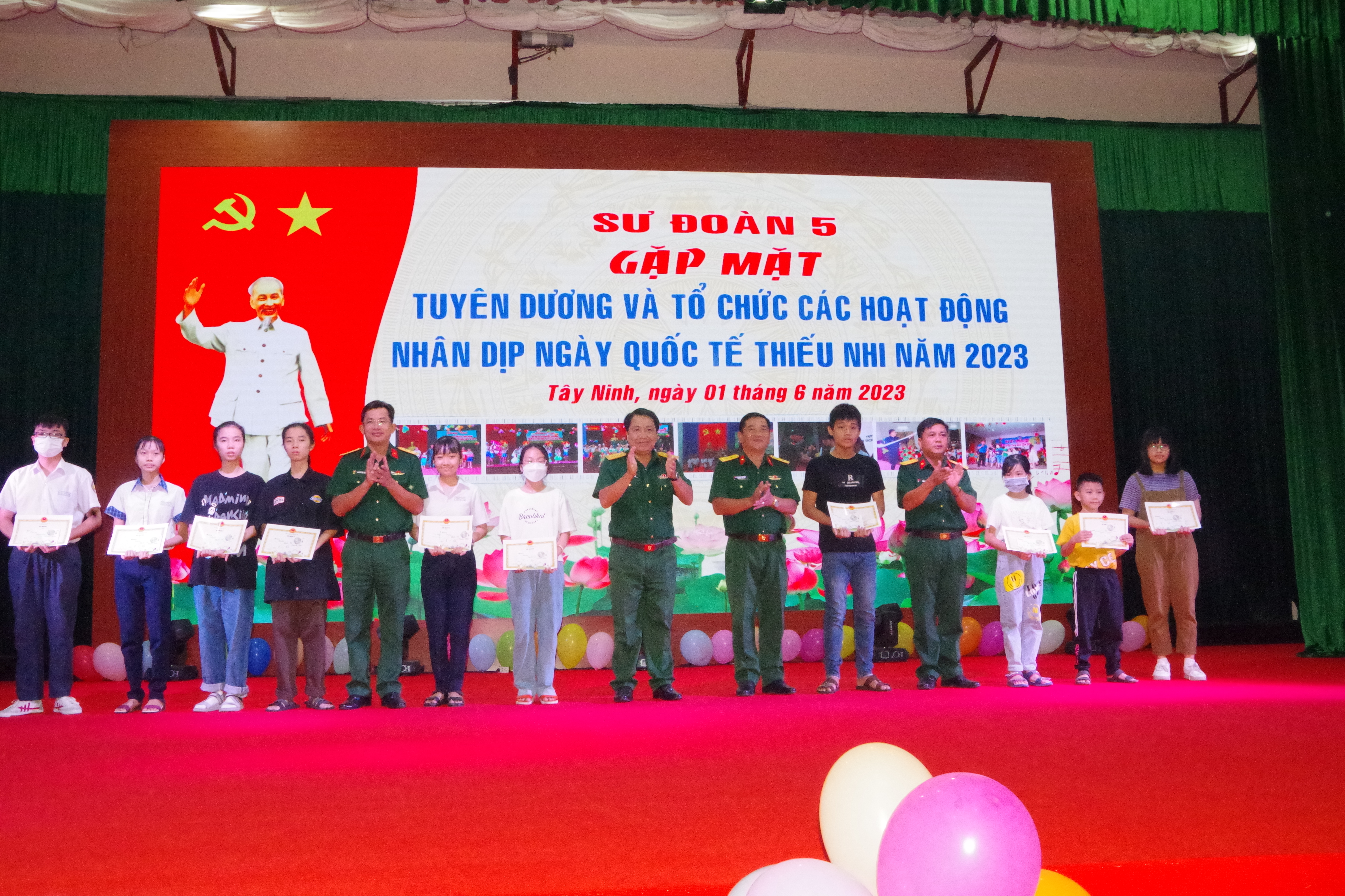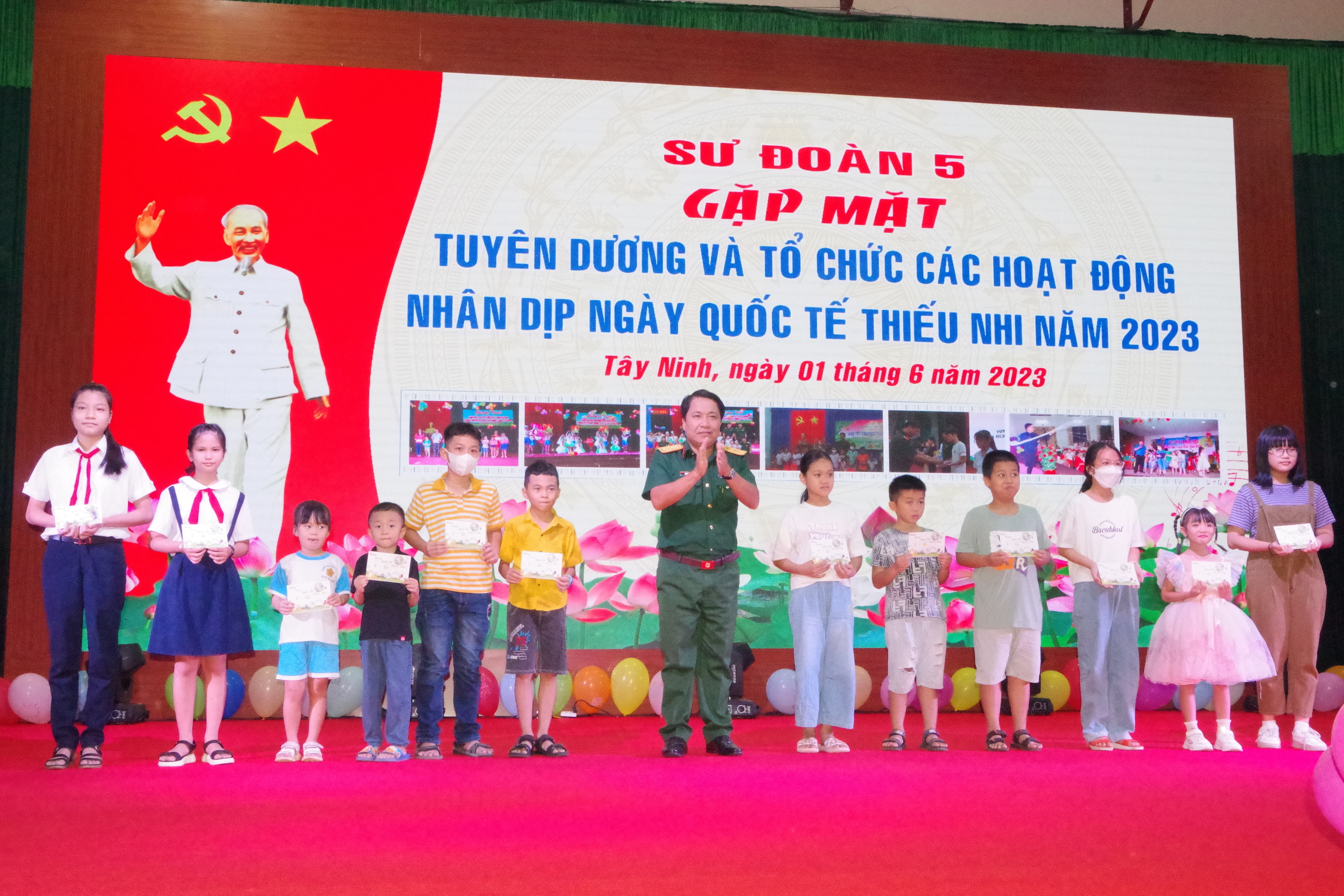 (QK7 Online) - Chiều 1/6, Sư đoàn 5 phối hợp với Trung tâm Học tập sinh hoạt Thanh Thiếu nhi tỉnh Tây Ninh tổ chức Chương trình Gặp mặt, tuyên dương các cháu học sinh đạt giải trong các cuộc thi năm học 2022 – 2023.