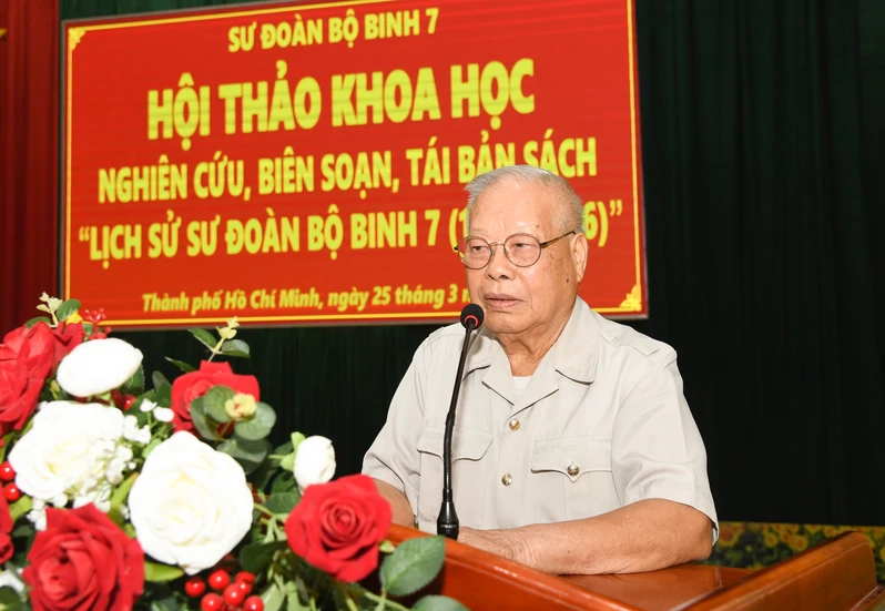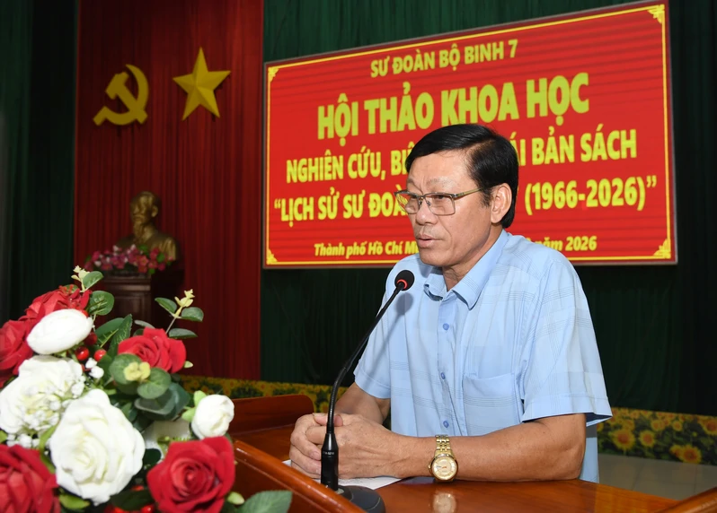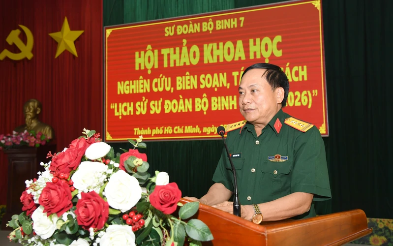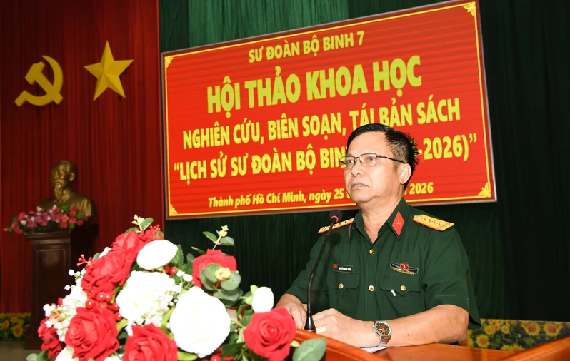 (QK7 Online) - Chiều ngày 25/3, Sư đoàn 7 tổ chức hội thảo khoa học nghiên cứu, biên soạn, tái bản cuốn sách “Lịch sử Sư đoàn bộ binh 7 (1966 - 2026)”. Đại tá Nguyễn Như Trúc, Phó Chủ nhiệm Chính trị Quân khu 7 dự và chỉ đạo hội thảo. Đại tá Nguyễn Doãn Nam, Bí thư Đảng ủy, Chính ủy Sư đoàn 7 chủ trì hội thảo. Dự hội nghị có đại diện Ban liên lạc truyền thống Sư đoàn 7, các đồng chí nguyên lãnh đạo, chỉ huy Sư đoàn qua các thời kỳ và Ban nghiên cứu, biên soạn.