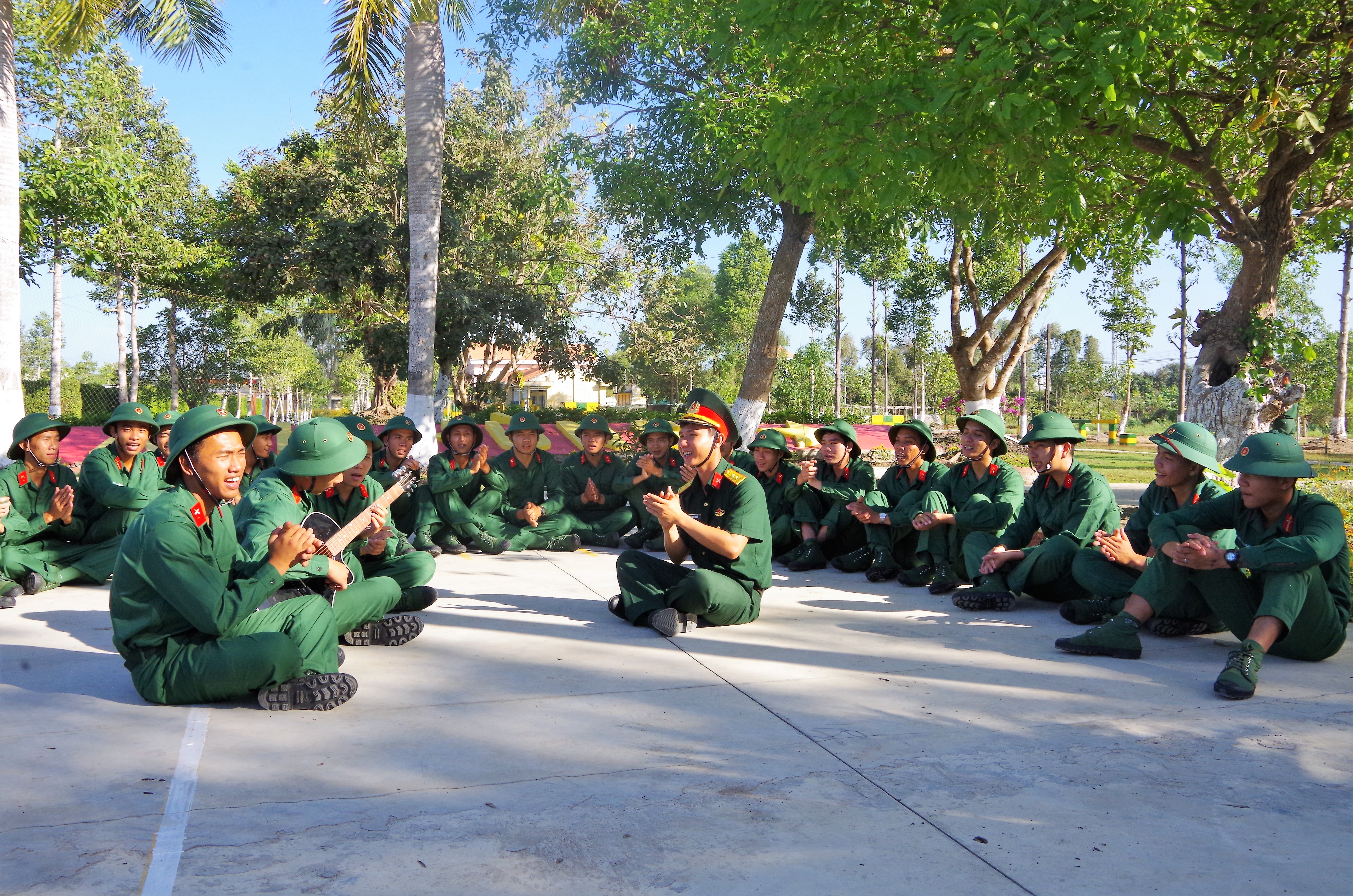 Chiến sĩ mới thư giãn với những tiết mục văn nghệ “cây nhà lá vườn”.