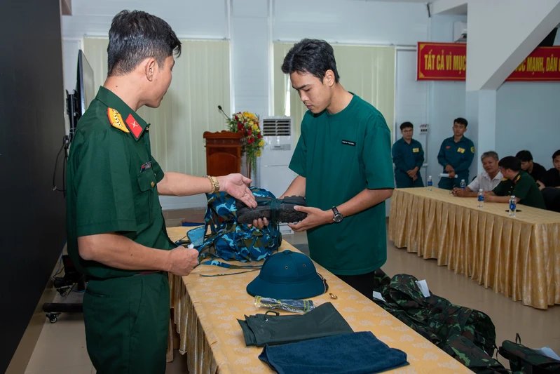 Cán bộ Ban chỉ huy quân sự phường Phước Tân kiểm tra, bàn giao quân trang cho thanh niên.