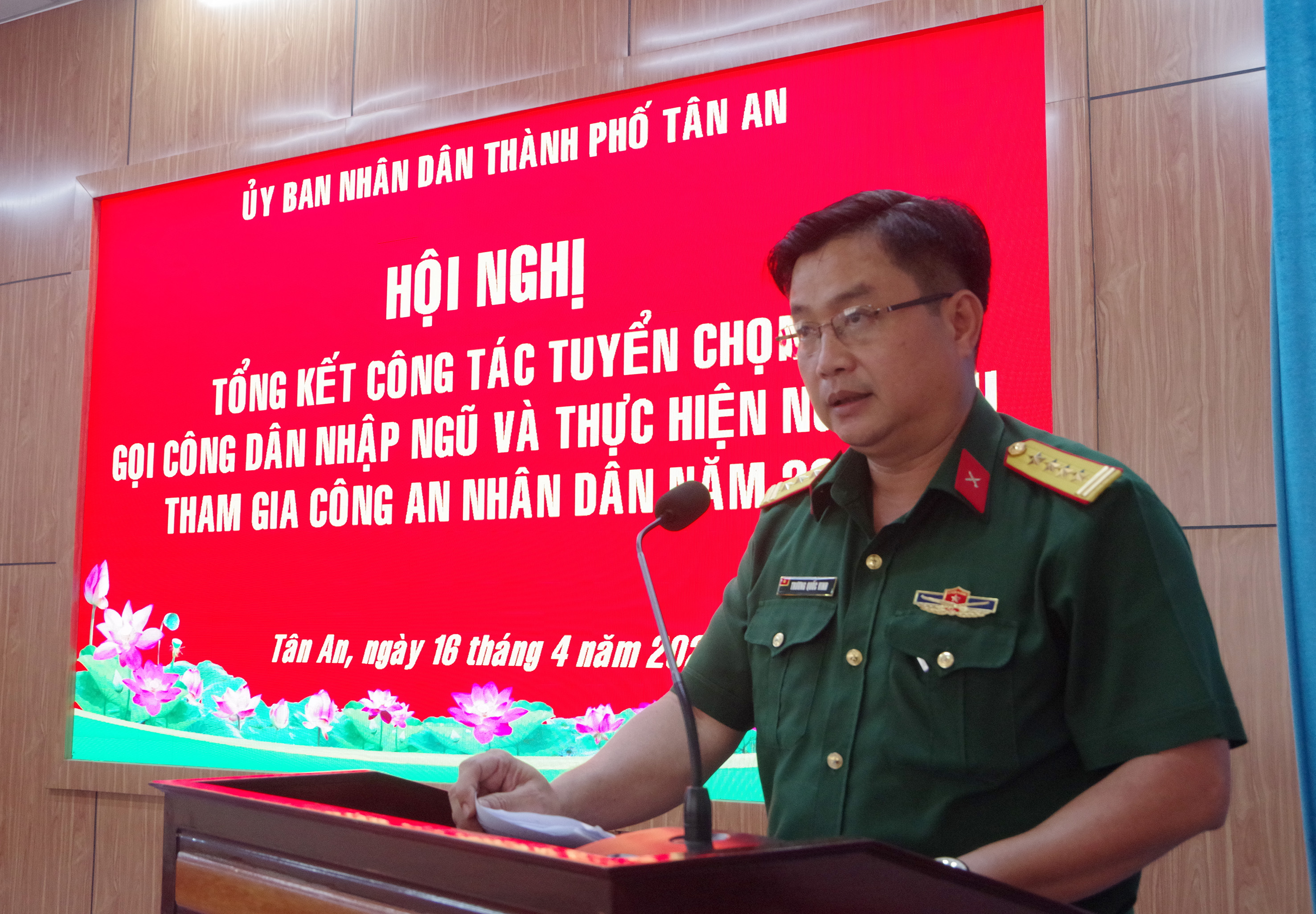Phát biểu tại hội nghị, Đại tá Trương Quốc Vinh, Phó Chỉ huy trưởng Bộ CHQS tỉnh đề nghị HĐNVQS thành phố Tân An tiếp tục chỉ đạo thực hiện chặt chẽ công tác tuyển quân năm 2025. Chú trọng chăm lo công tác đào tạo nghề, tạo công ăn việc làm cho quân nhân xuất ngũ trở về địa phương.