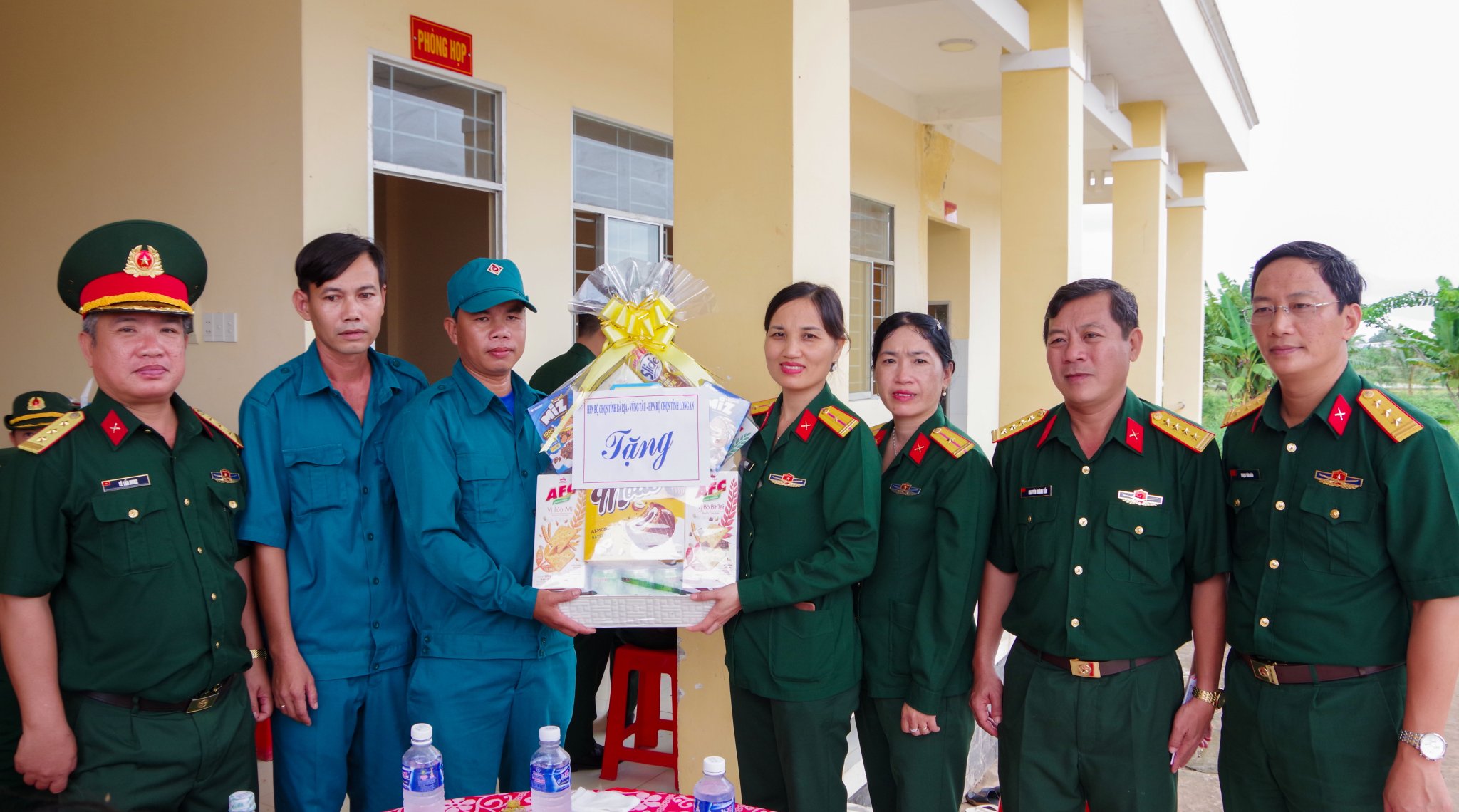 Thiếu tá CN Lê Thị Vân cùng đoàn công tác Bộ CHQS tỉnh tặng quà chốt dân quân Thái Bình Trung, huyện Vĩnh Hưng, tỉnh Long An.