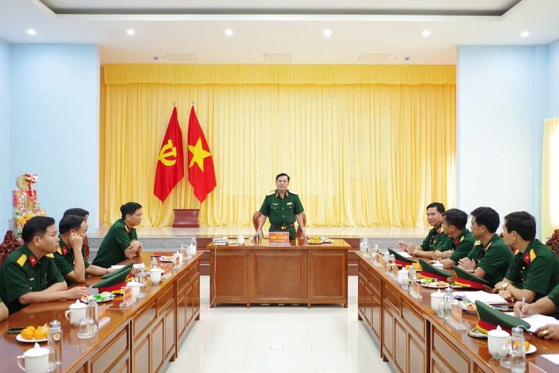 Thiếu tướng Đặng Văn Lẫm, Ủy viên Ban Thường vụ Đảng ủy, Phó Tư lệnh Quân khu 7 phát biểu chúc mừng năm mới tại Sư đoàn 7.