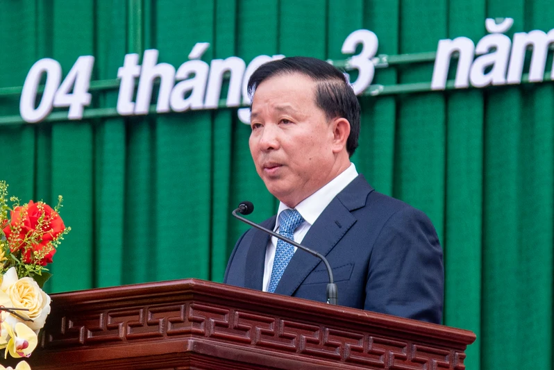 Đồng chí Nguyễn Văn Út, Phó Bí thư Tỉnh ủy, Chủ tịch UBND tỉnh, Chủ tịch Hội đồng NVQS tỉnh Đồng Nai động viên các thanh niên lên đường nhập ngũ.
