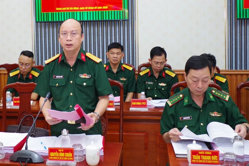 Đại tá Nguyễn Đình Chuẩn, Phó Chính ủy Bộ Tư lệnh TP. Hồ Chí Minh báo cáo kết quả triển khai công tác bầu cử ĐBQH khóa XVI và ĐB HĐND các cấp nhiệm kỳ 2026-2031.