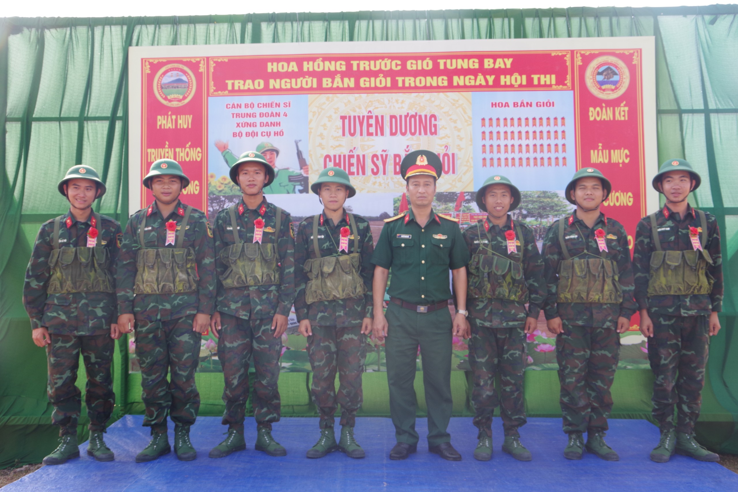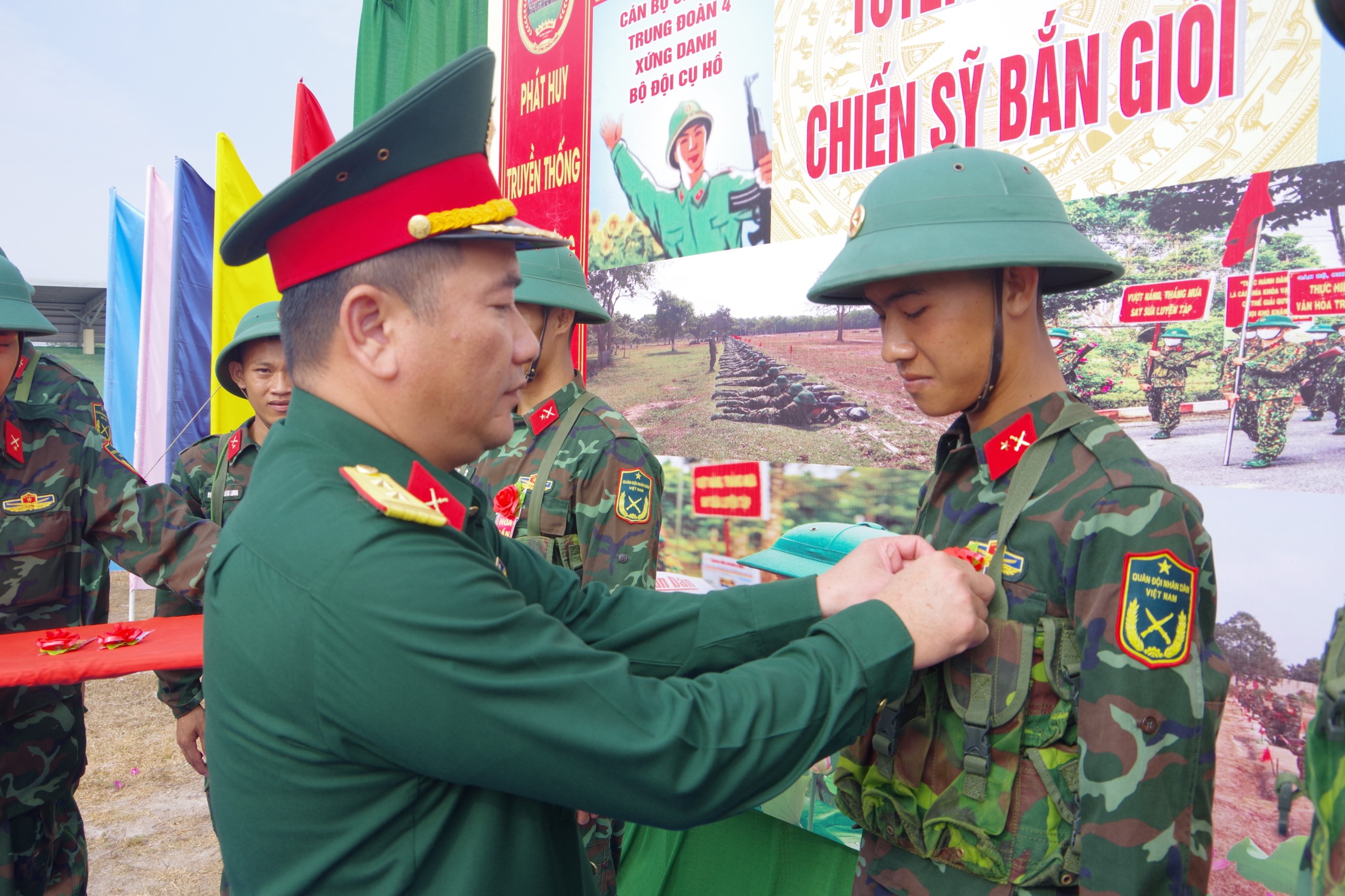 Chỉ huy đơn vị gắn hoa cho chiến sĩ bắn giỏi.