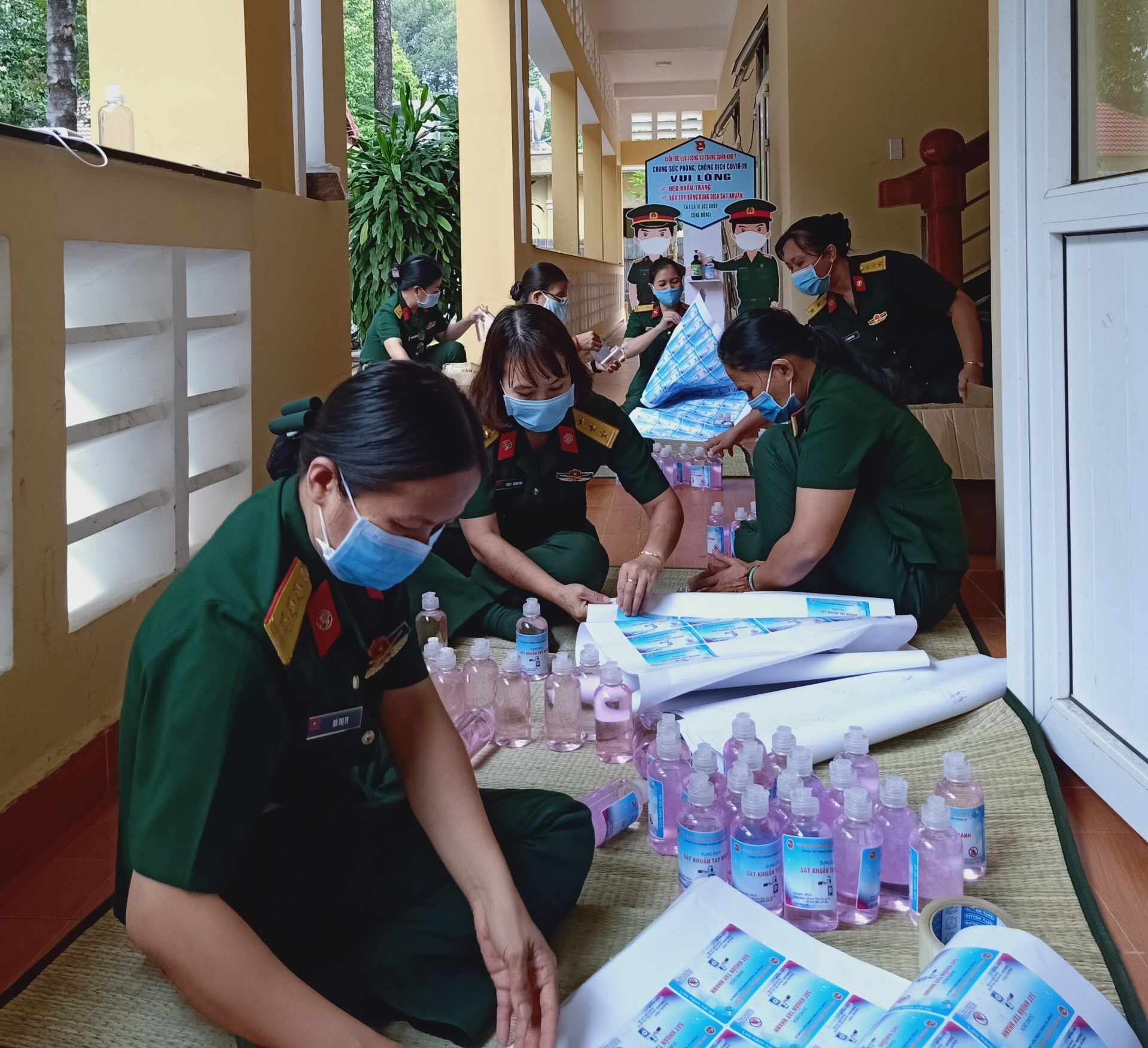 Chi hội phụ nữ Cục Chính trị và Lữ đoàn 23 đang vô chai, dán nhãn các dung dịch sát khuẩn gửi tặng nơi biên giới.