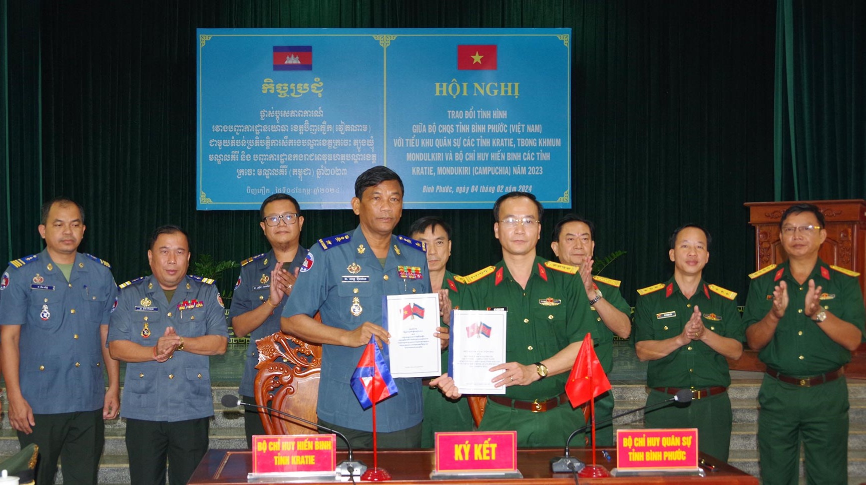 Tại hội nghị, đại diện Bộ CHQS tỉnh Bình Phước, Tiểu khu Quân sự các tỉnh Kratie, Mondulkiri, Tbong Khmum và Bộ chỉ huy Hiến binh các tỉnh Kratie, Mondulkiri thuộc Vương quốc Campuchia thảo luận và thống nhất ký kết nội dung, phương hướng hợp tác năm 2024.