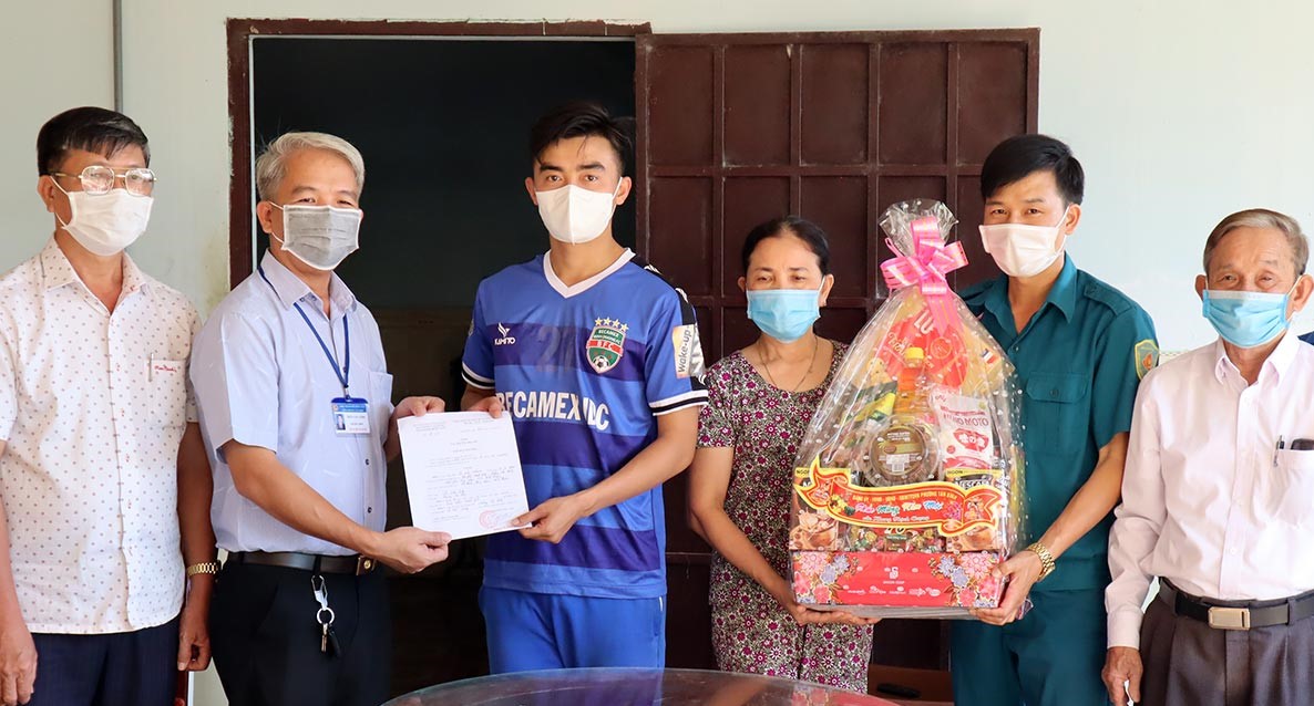 Hội đồng nghĩa vụ quân sự phường Tân Bình (TP.Đồng Xoài) trao lệnh gọi nhập ngũ và tặng quà tết cho thanh niên trúng tuyển cùng gia đình.