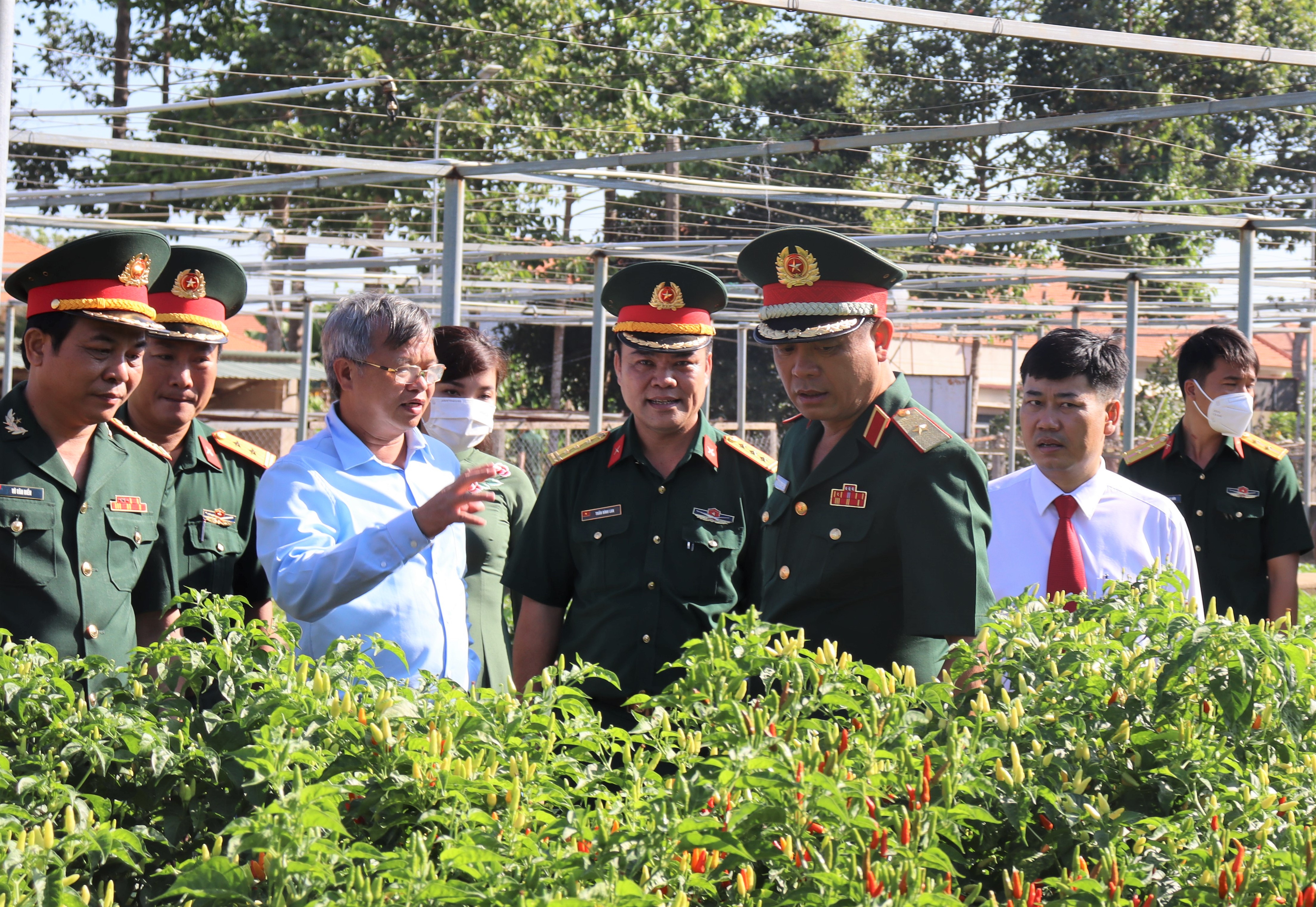 Đồng chí Cao Tiến Dũng, Phó Bí thư Tỉnh ủy, Chủ tịch Ủy ban Nhân dân tỉnh Đồng Nai (thứ 3 bên trái) giới thiệu với Thiếu tướng Nguyễn Trường Thắng, Ủy viên Trung ương Đảng, Tư lệnh Quân khu 7 về kết quả tăng gia sản xuất của LLVT tỉnh Đồng Nai. Ảnh: CTV