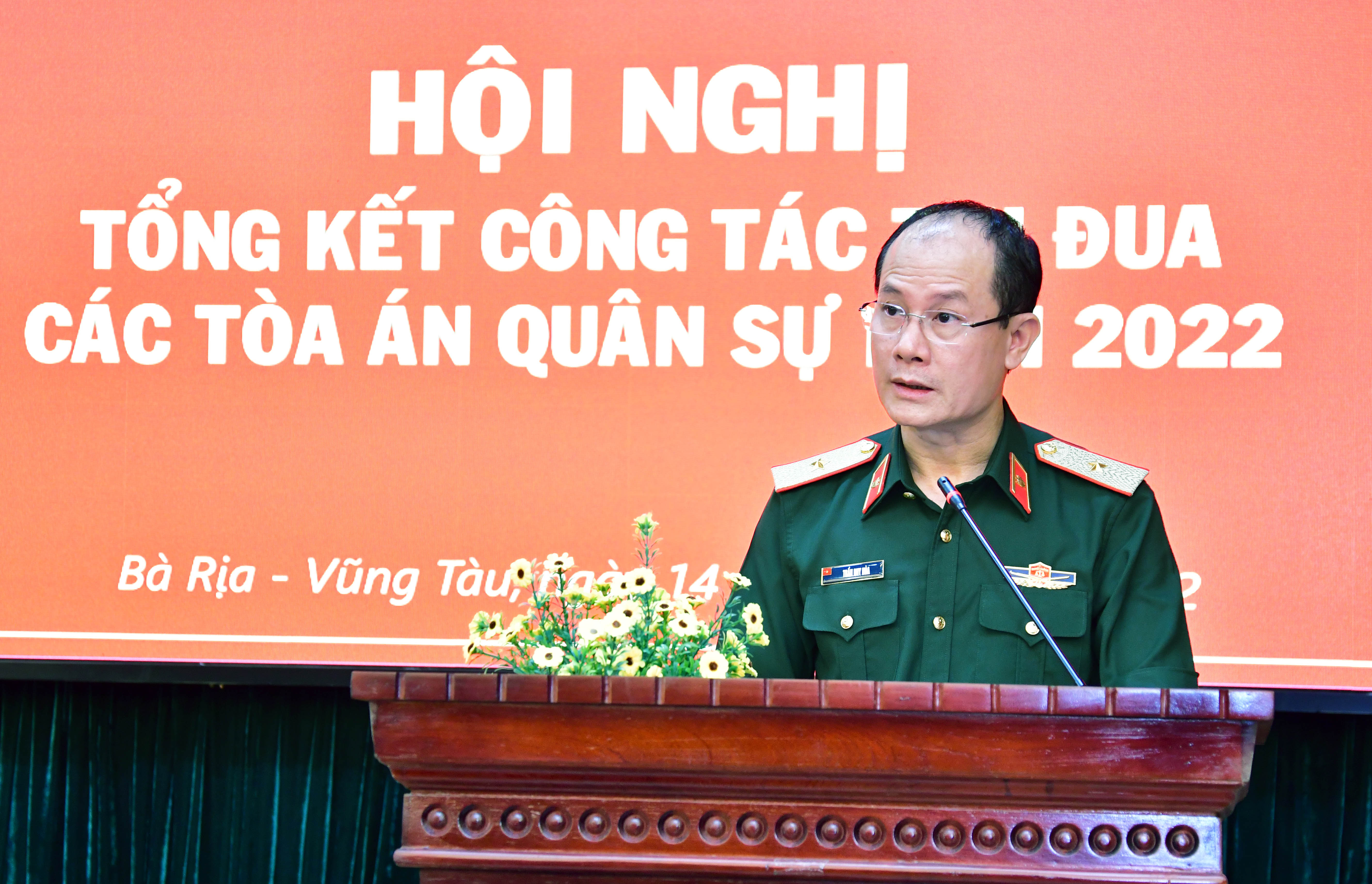 Thiếu tướng Trần Duy Hòa, Phó Chánh án Tòa án Quân sự Trung ương báo cáo kết quả phong trào thi đua.
