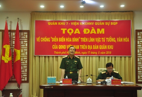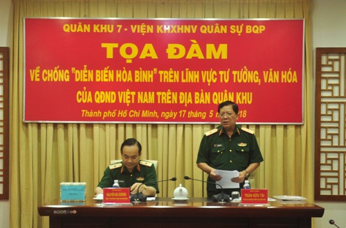 (QK7 Online) - Sáng 17-5, Bộ Tư lệnh Quân khu 7 phối hợp Viện Khoa học Xã hội Nhân văn (KHXHNV) Quân sự Bộ Quốc phòng tổ chức tọa đàm chống “Diễn biến hòa bình” trên lĩnh vực tư tưởng, văn hóa của QĐND Việt Nam trên địa bàn Quân khu. Thiếu tướng, PGS-TS-Nhà giáo Nhân dân Nguyễn Bá Dương, Viện trưởng Viện KHXHNV Quân sự và Thiếu tướng Trần Hữu Tài,  Phó Chủ nhiệm Chính trị Quân khu đồng chủ trì tọa đàm.