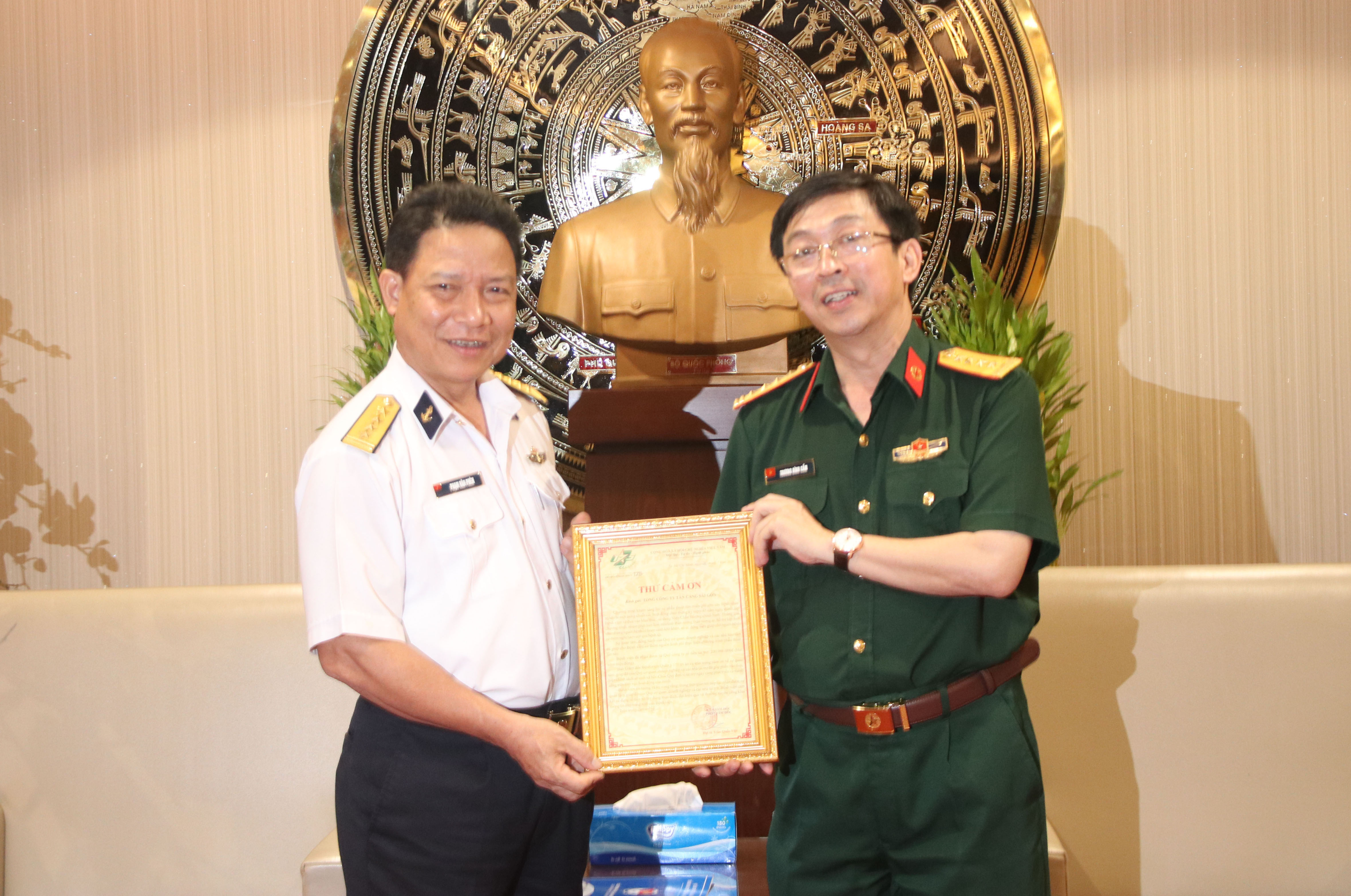 Đại tá Trương Đình Cẩm, Phó Giám đốc Bệnh viện trao thư cảm ơn Tổng công ty Tân Cảng Sài Gòn.