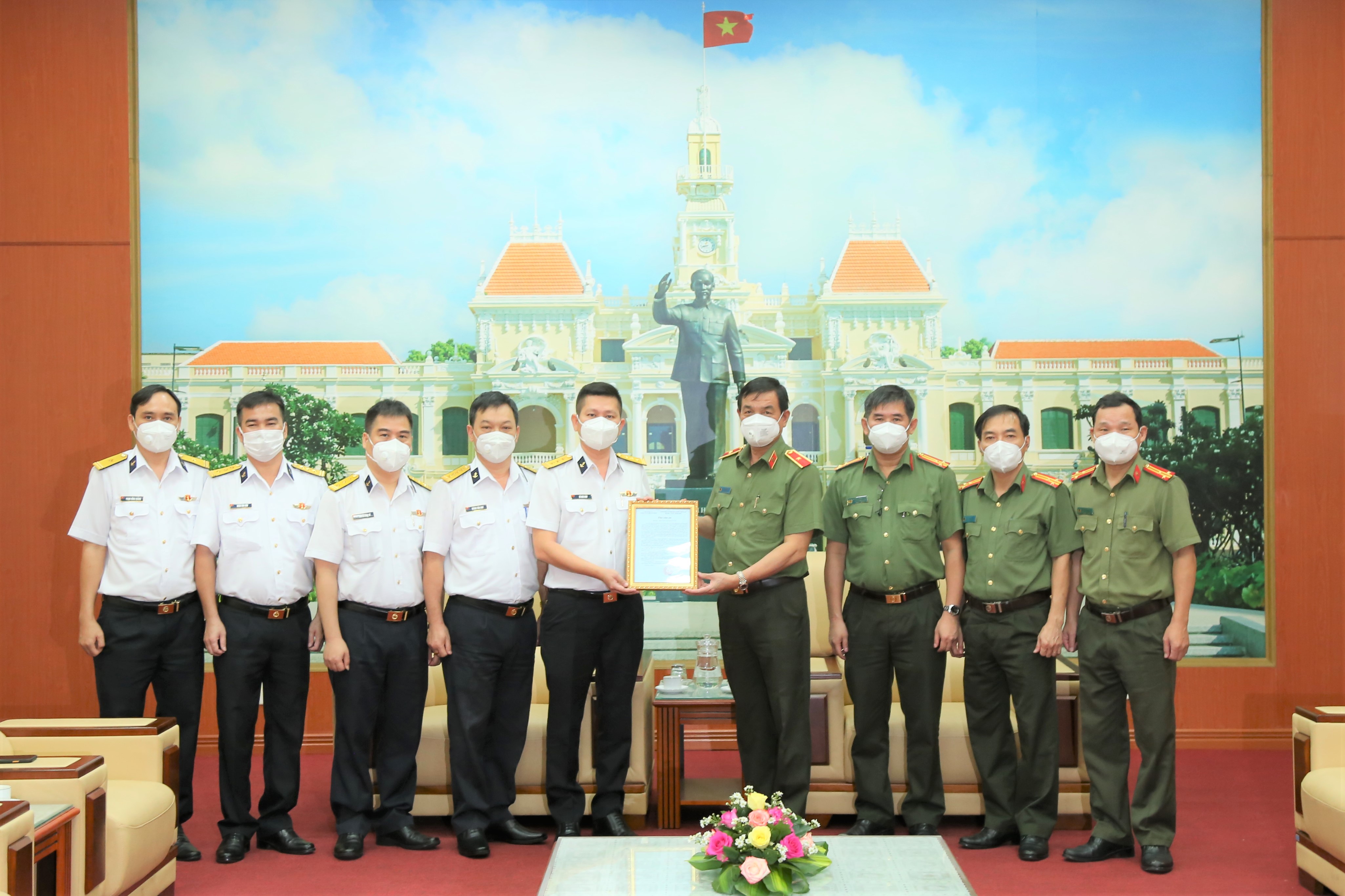 (QK7 Online) - Sáng 6/10, đoàn công tác của Tổng công ty (TCT) Tân cảng Sài Gòn do Thượng tá Võ Hoài Nam, Phó Tổng Giám đốc đến trao kinh phí hỗ trợ cán bộ, chiến sĩ Công an Thành phố Hồ Chí Minh phòng, chống dịch Covid-19. Thiếu tướng Lê Hồng Nam, Giám đốc Công an Thành phố chủ trì buổi tiếp nhận kinh phí.