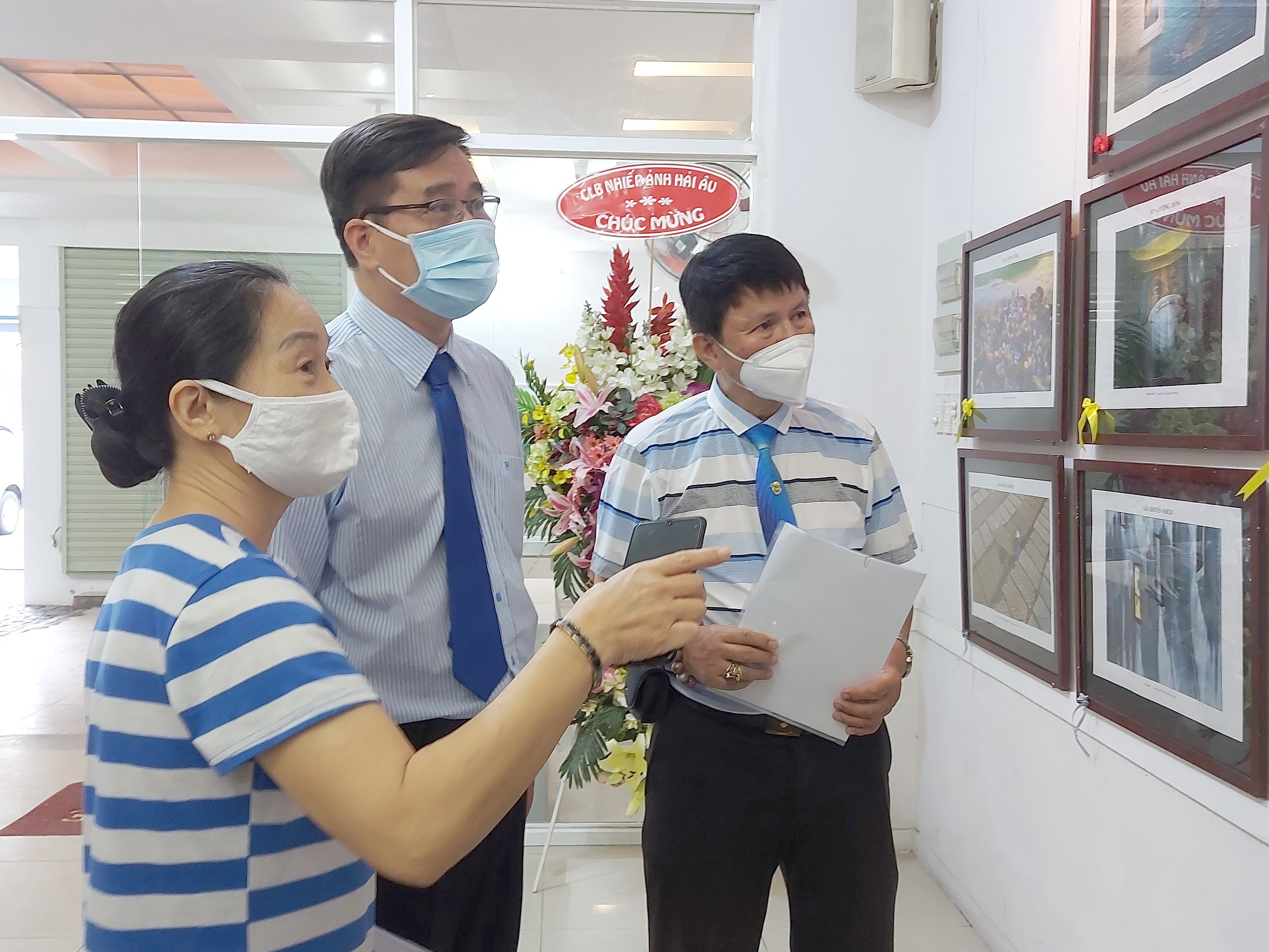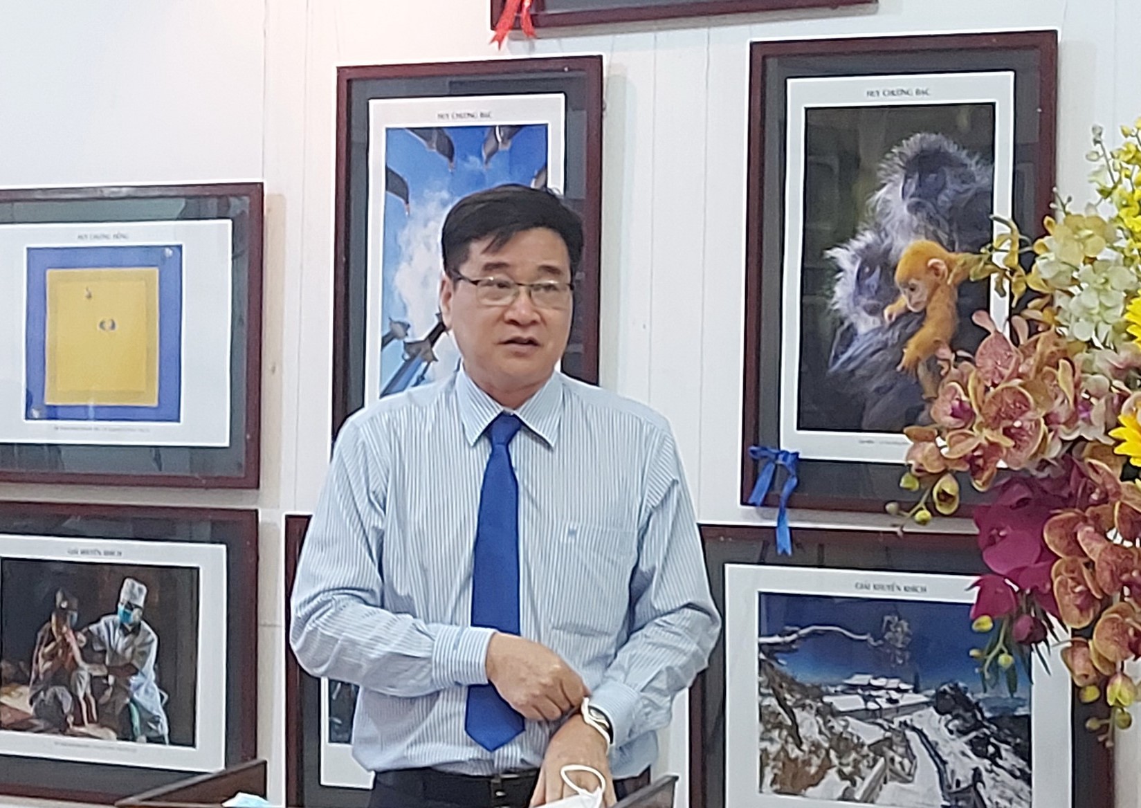 NSNA Đoàn Hoài Trung, Chủ tịch Hội Nhiếp ảnh TP.HCM, Trưởng Ban Tổ chức Liên hoan (bên phải) hướng dẫn đại biểu tham quan ảnh triển lãm.