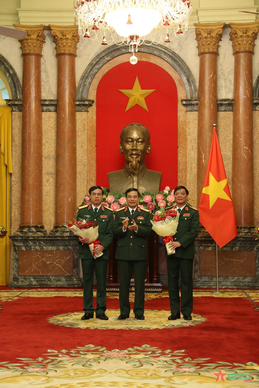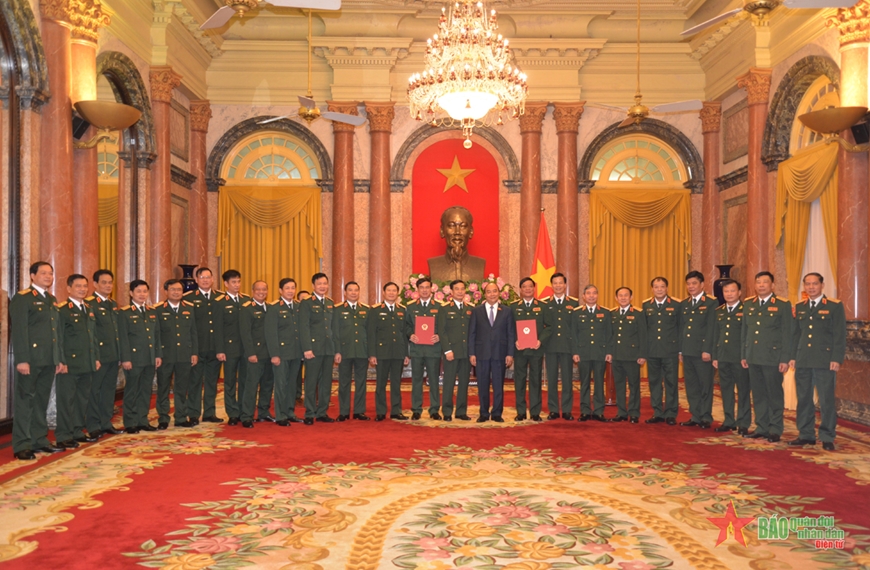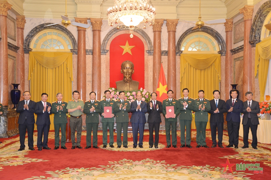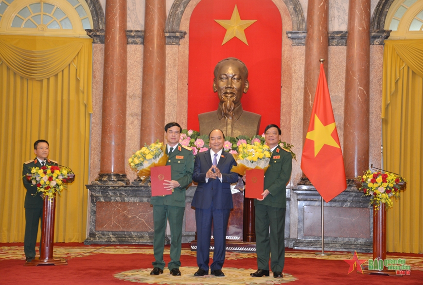 Chủ tịch nước Nguyễn Xuân Phúc trao quyết định thăng quân hàm từ Trung tướng lên Thượng tướng đối với đồng chí Ngô Minh Tiến và đồng chí Lương Đình Hồng.