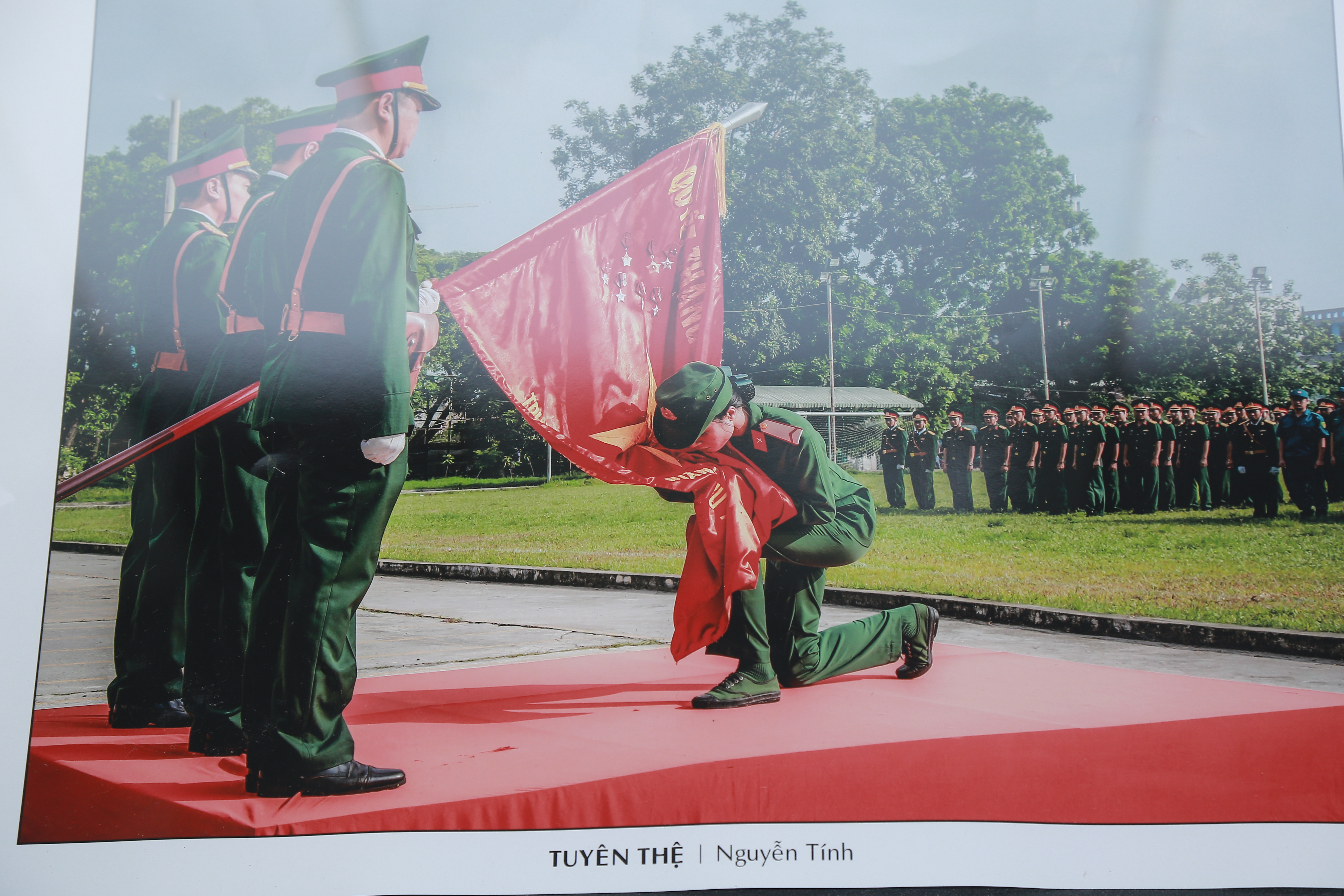 “Trong những tác phẩm đang trưng bày, tôi tâm đắc và ấn tượng nhất với tác phẩm “Tuyên thệ”, đặc biệt đây là hình ảnh nữ chiến sĩ đang tuyên thệ. Thông qua tác phẩm, tôi muốn diễn tả cho độc giả thấy khoảnh khắc của nữ tân binh đã hoàn thành khóa huấn luyện, giờ đây không chỉ rắn rỏi về thể chất mà đã trưởng thành hơn về tư tưởng, bản lĩnh và lối sống”. Nhiếp ảnh gia Nguyễn Hữu Tính chia sẻ.