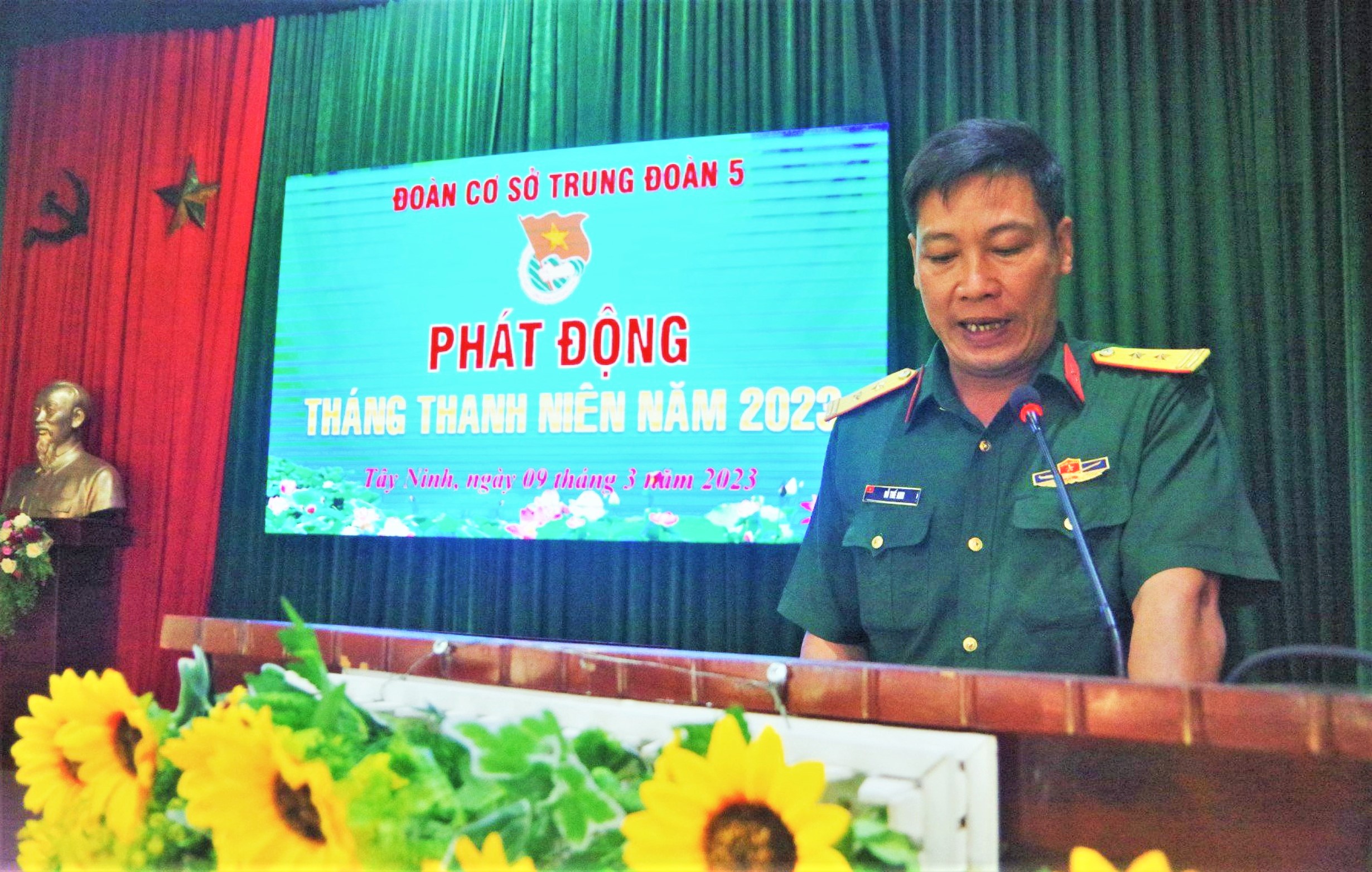 Trung tá Đỗ Thế Anh, Phó Chủ nhiệm Chính trị, Bí thư Đoàn Cơ sở Trung đoàn 5 phát động Tháng Thanh niên năm 2023