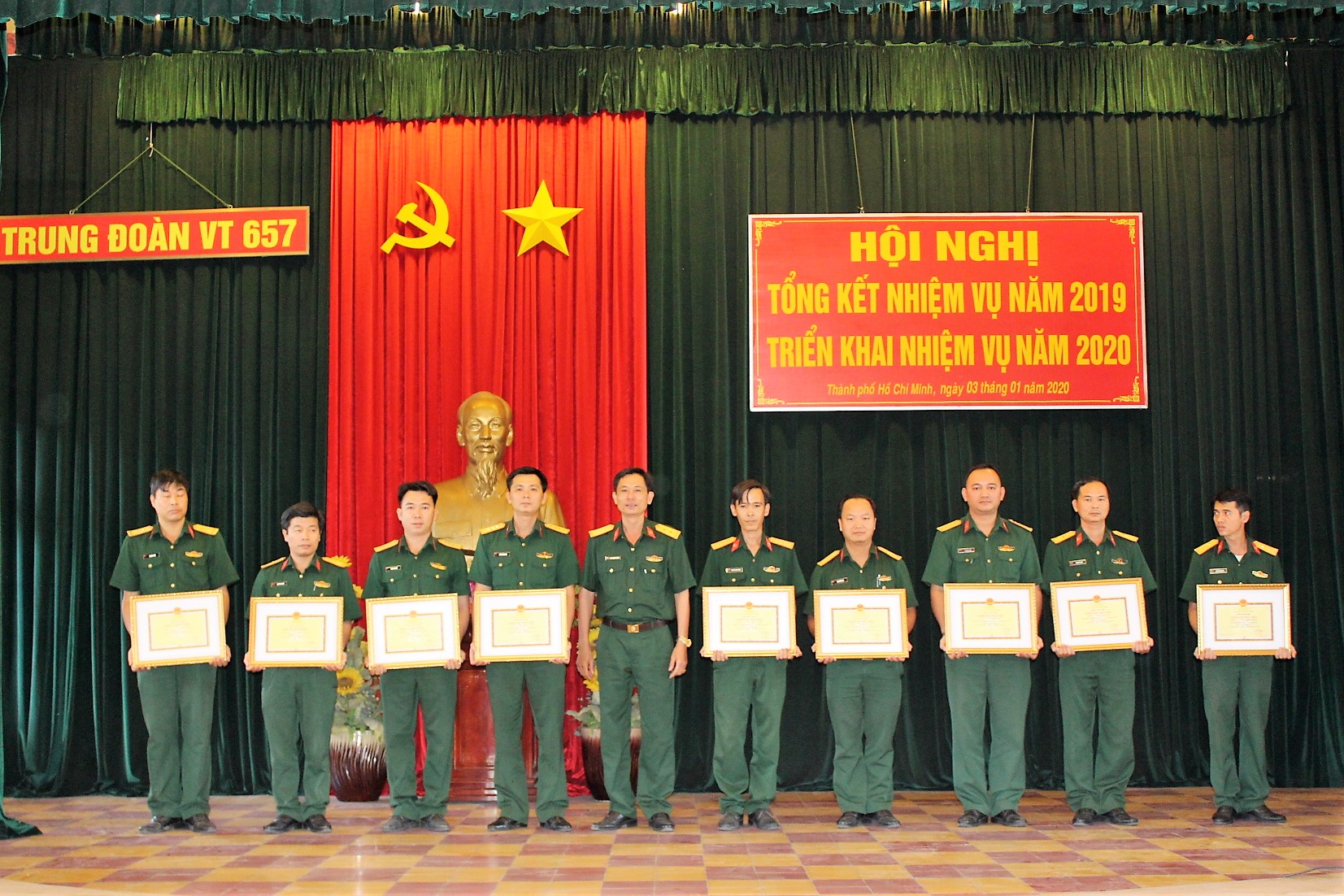 Chỉ huy Trung đoàn khen thưởng các tập thể, cá nhân hoàn thành xuất sắc nhiệm vụ năm 2019. Ảnh: CTV