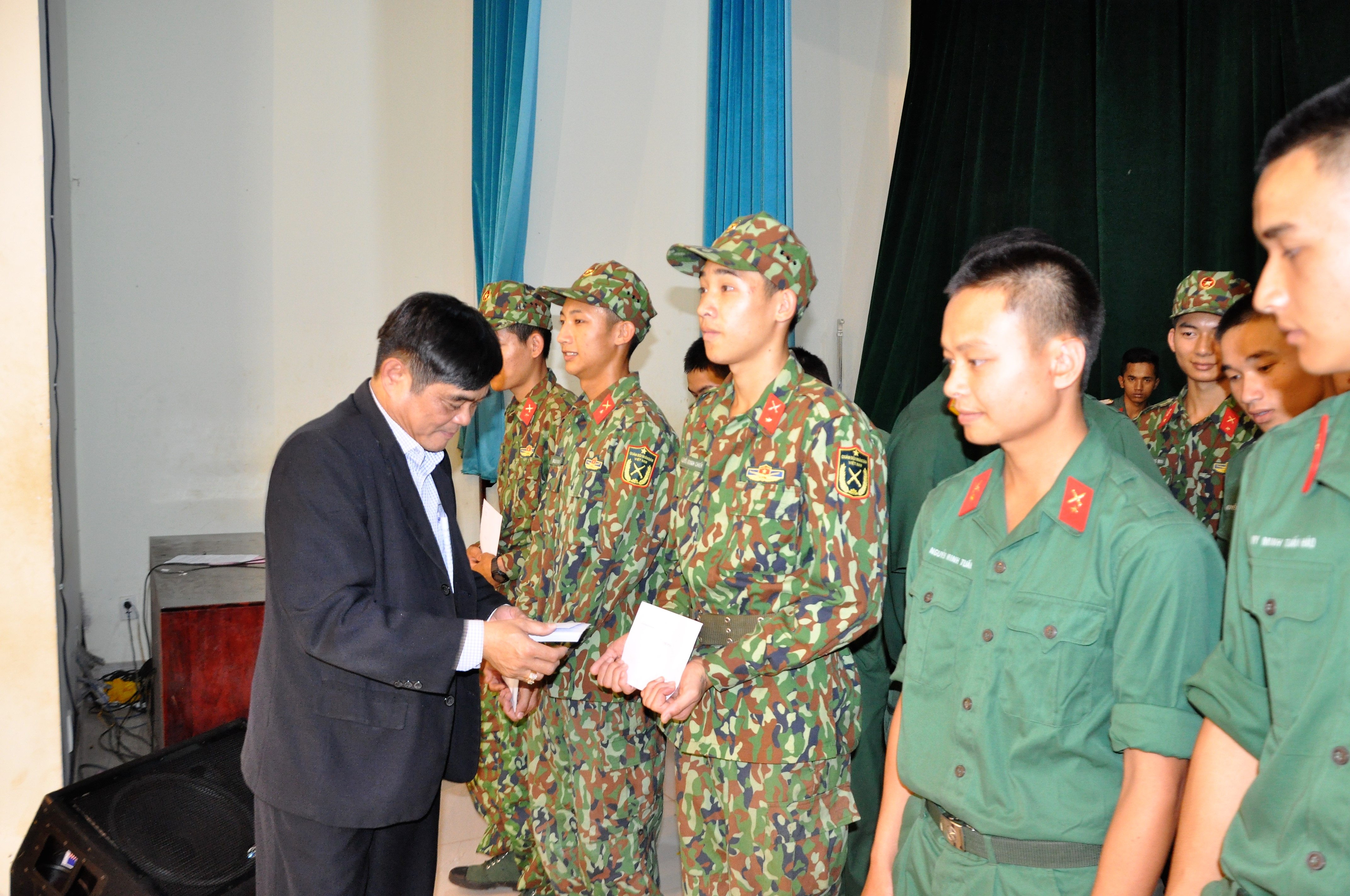 Ông Hà Văn Thuận, Chủ tịch HĐND huyện Lâm Hà tặng quà cho các chiến sĩ mới của huyện Lâm Hà, tỉnh Lâm Đồng.