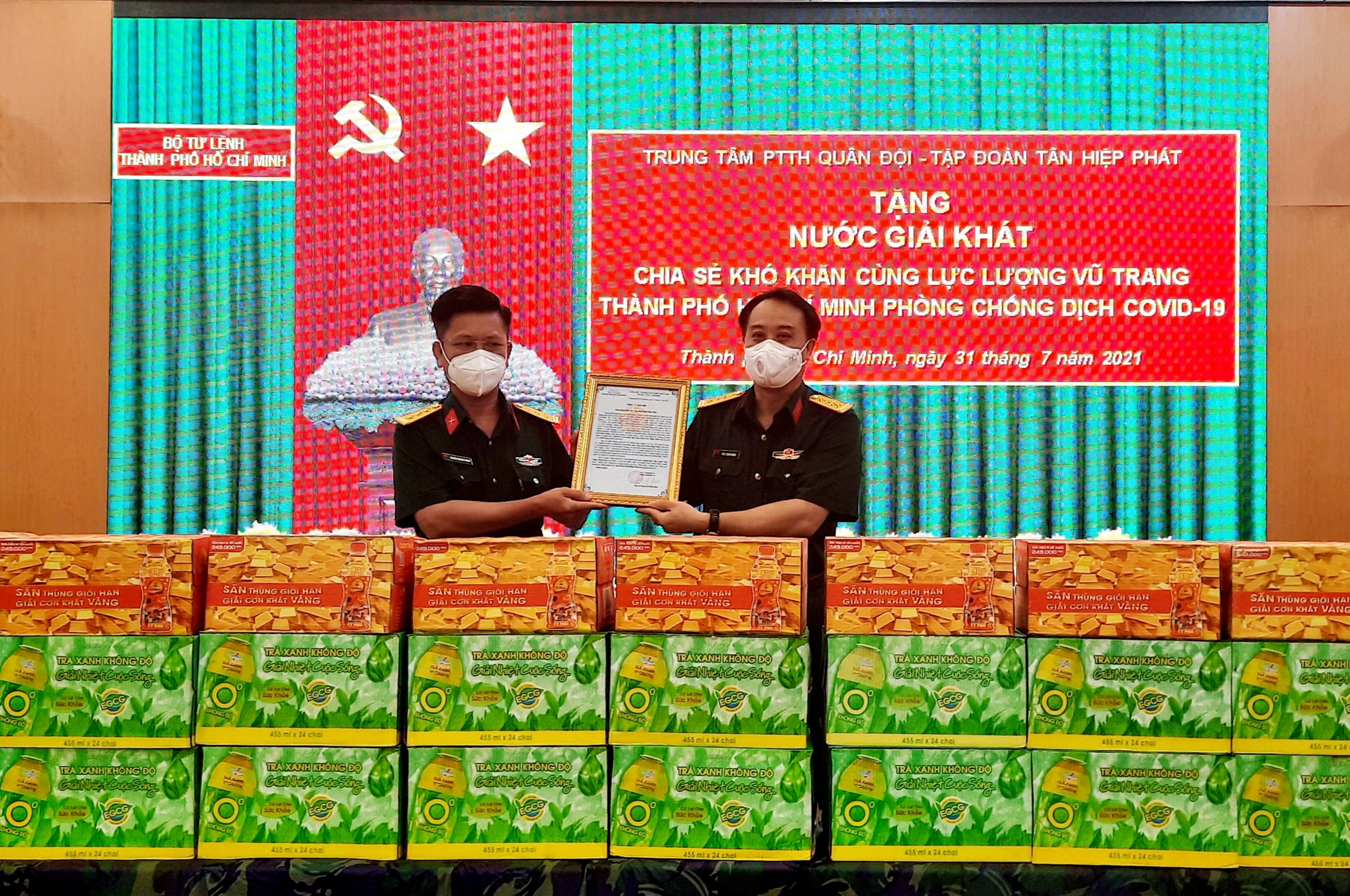 (QK7 Online) - Chiều 31/7, Trung tâm Phát thanh – Truyền hình Quân đội phối hợp với Tập đoàn Tân Hiệp Phát trao 3 nghìn thùng nước giải khát tặng đến Bộ Tư lệnh Thành phố Hồ Chí Minh. Tiếp tục đồng hành với cán bộ, chiến sĩ và bà con nhân dân trên tuyến đầu chống dịch COVID-19.