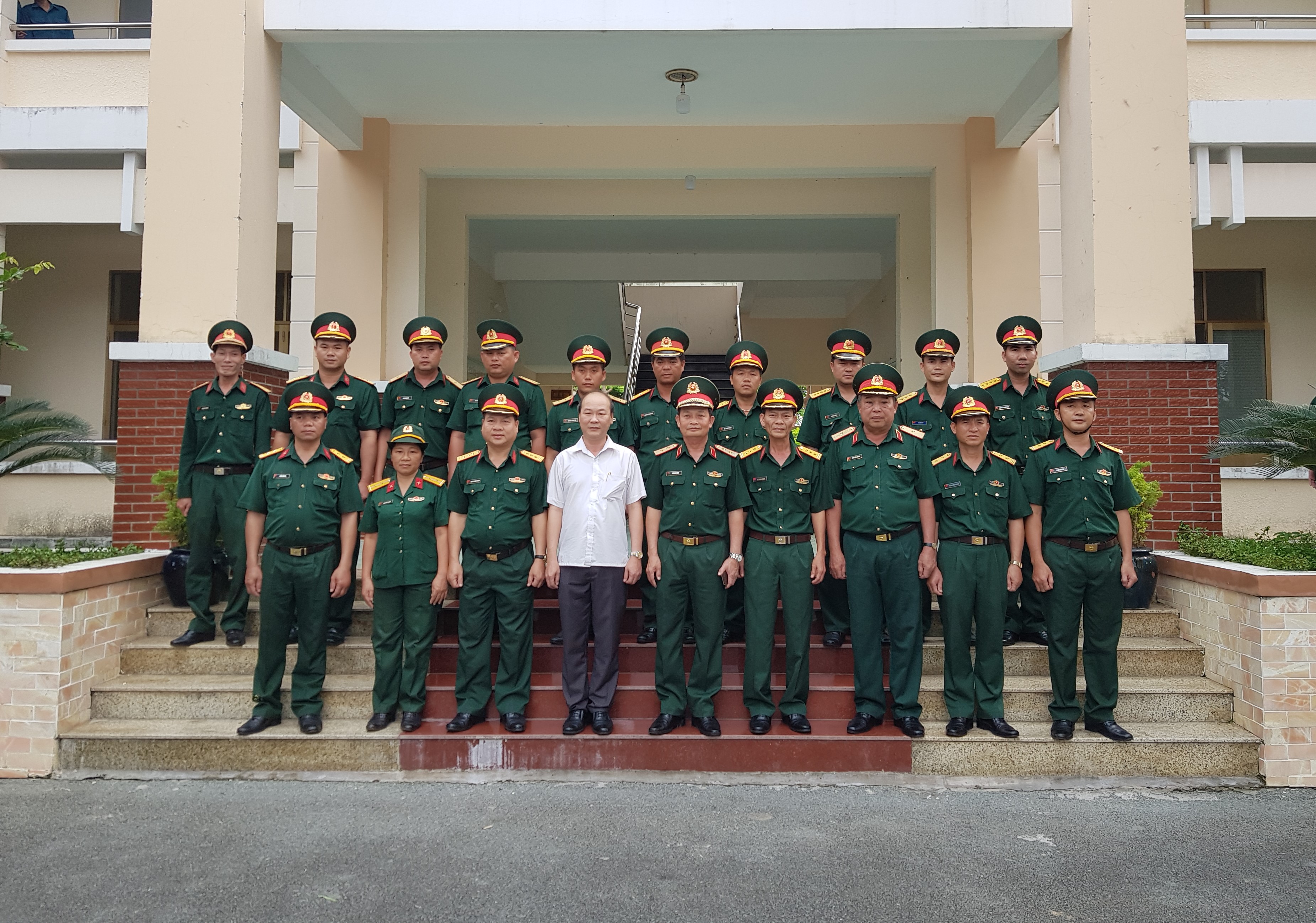 Cần Giờ (áo trắng) chụp hình lưu niệm cùng cán bộ, chiến sĩ Ban CHQS huyện Cần Giờ