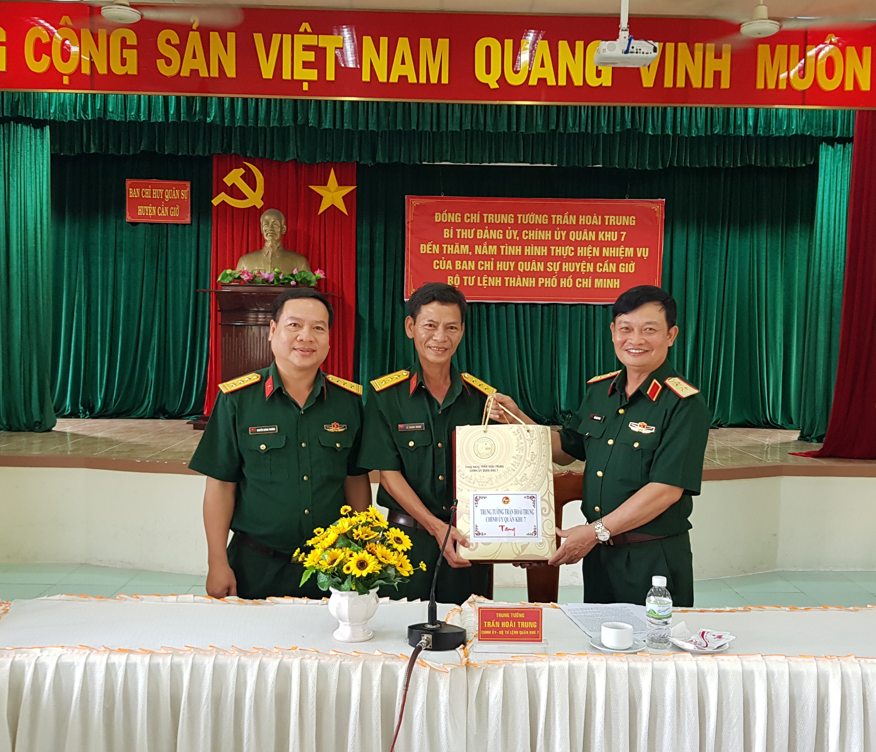 (QK7 Online) - Ngày 31/7, Trung tướng Trần Hoài Trung, Bí thư Đảng ủy, Chính ủy Quân khu 7 đến thăm, nắm tình hình thực hiện nhiệm vụ của Ban CHQS huyện Cần Giờ - Bộ Tư lệnh TPHCM. Tham gia cùng đoàn có Thiếu tướng Ngô Tuấn Nghĩa, Chính ủy Bộ Tư lệnh TPHCM.