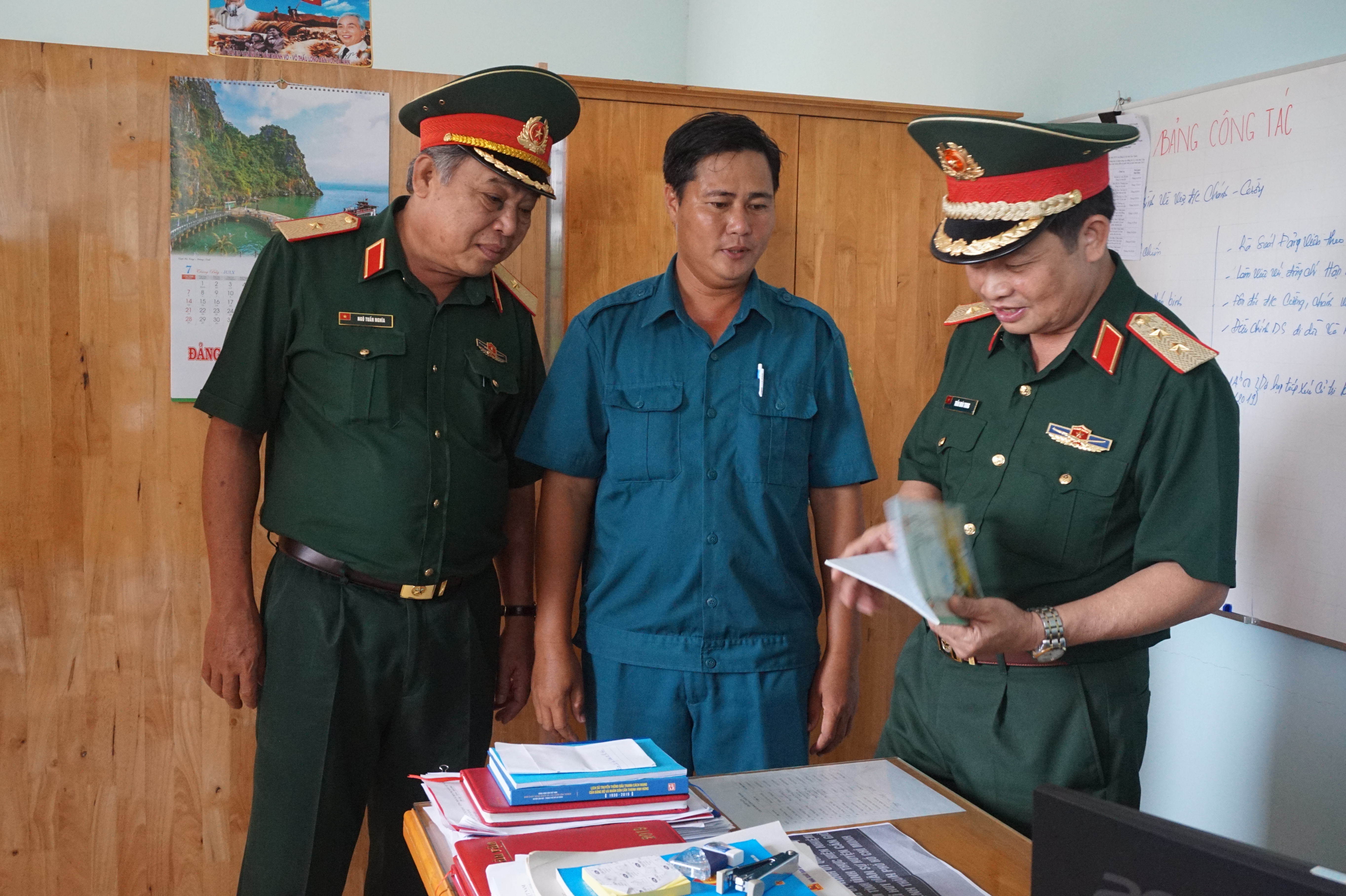 Đồng chí Chính ủy Quân khu kiểm tra sổ sách của Chỉ huy Thị trấn Cần Thạnh