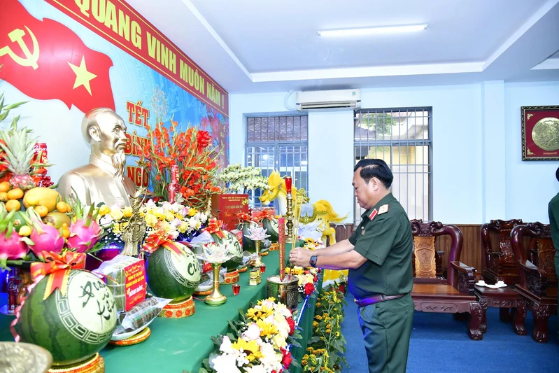 Trung tướng Trần Vinh Ngọc, Bí thư Đảng ủy, Chính ủy Quân khu thắp hương bàn thờ Bác Hồ tại Trung đoàn Gia Định.