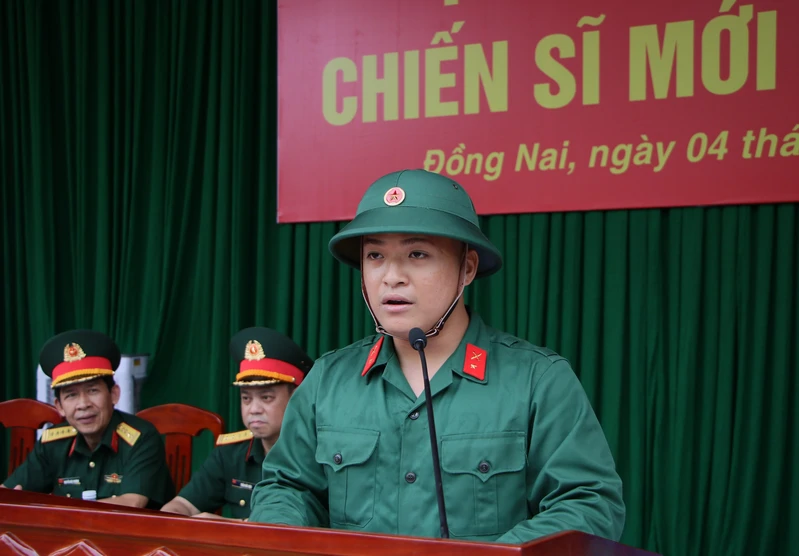Đại diện chiến sĩ mới phát biểu tại Lễ giao nhận quân 2026.
