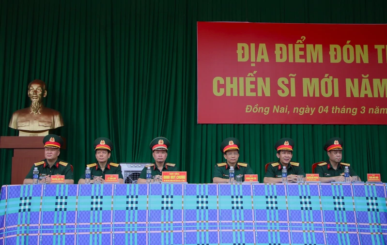 Thiếu tướng Đinh Huy Chung, Phó Tham mưu trưởng, Tổng cục Hậu cần - Kỹ thuật và Ban Giám hiệu Nhà trường động viên chiến sĩ mới.