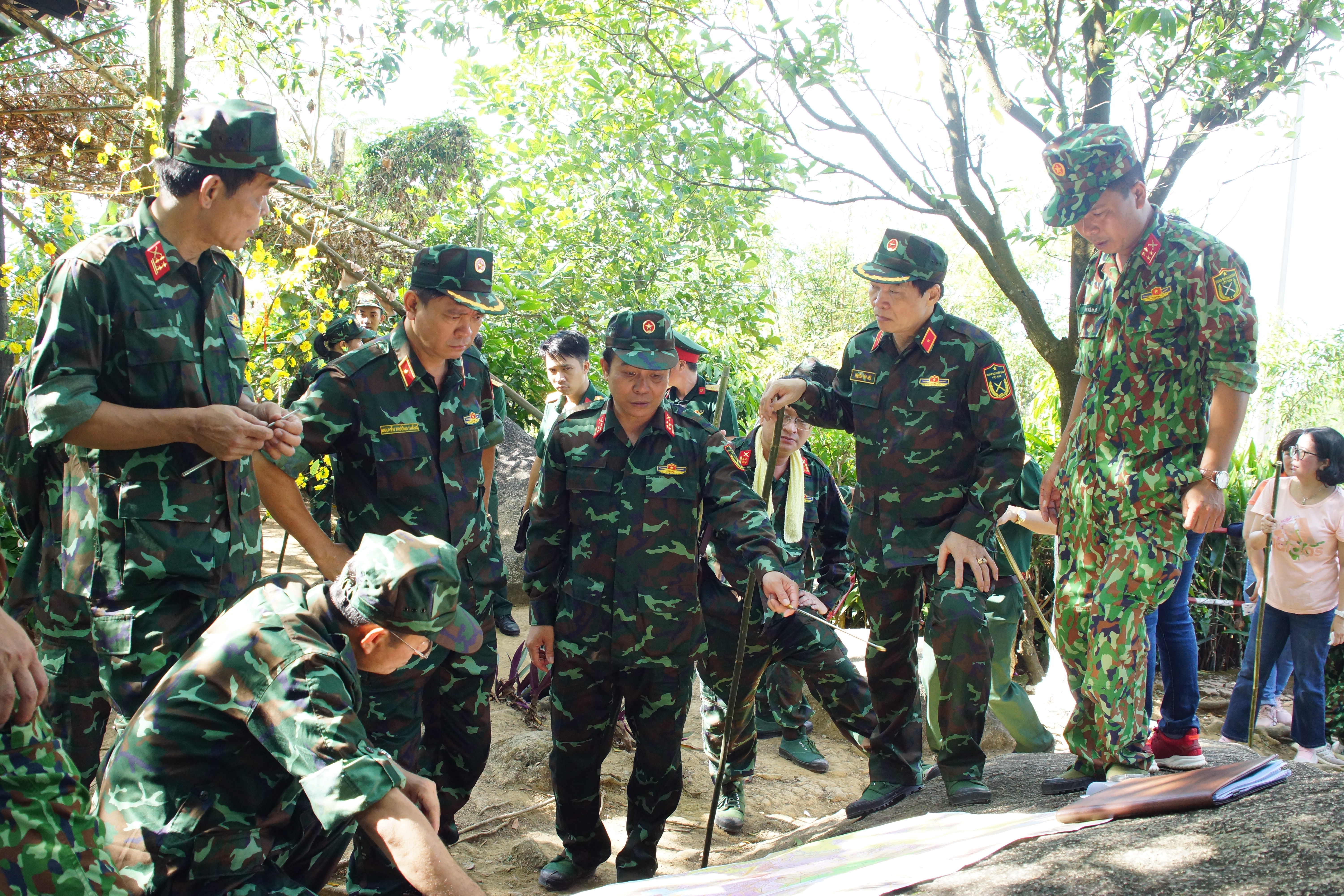 Đại tá Vũ Văn Điền, chỉ huy trưởng Bộ chỉ huy quân sự tỉnh Đồng Nai báo cáo với đoàn công tác về địa hình, thực trạng của Trạm trung gian chuyển tiếp của Bộ chỉ huy quân sự tỉnh