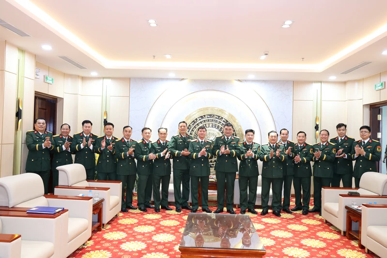 Trung tướng Lê Xuân Thế, Ủy viên Trung ương Đảng, Tư lệnh Quân khu và Trung tướng Trần Vinh Ngọc, Bí thư Đảng ủy, Chính ủy Quân khu chụp hình lưu niệm cùng cán bộ Cục Chính trị Quân khu.