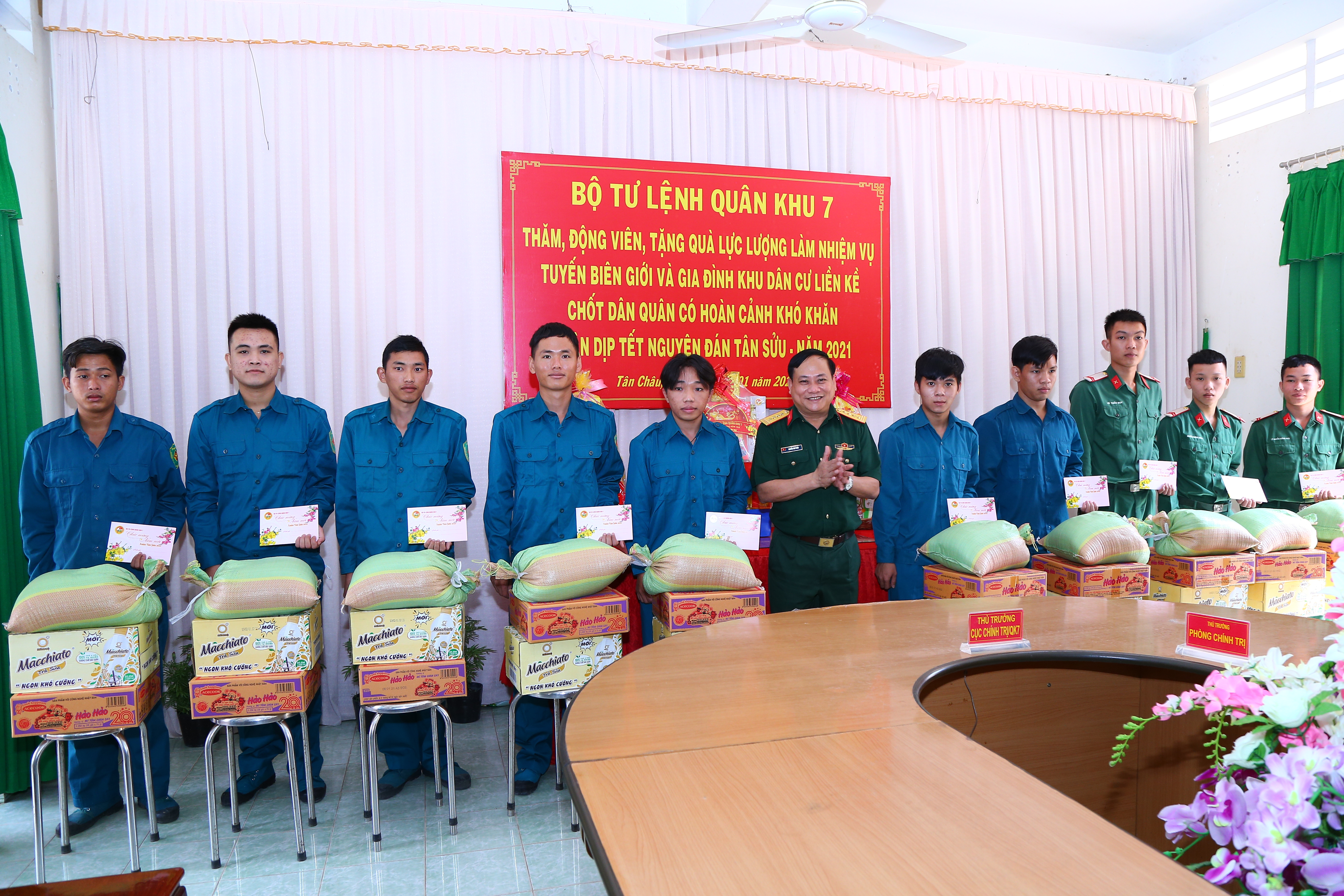 Đại tá Nguyễn Như Trúc, Phó Chủ nhiệm Chính trị Quân khu thăm, tặng quà cán bộ, ĐVTN tỉnh Tây Ninh thực hiện nhiệm vụ trên biên giới.