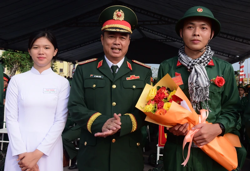 Thiếu tướng Lê Xuân Bình, Phó Tư lệnh – Tham mưu trưởng Quân khu 7 tặng hoa chúc mừng thanh niên trước khi về đơn vị.