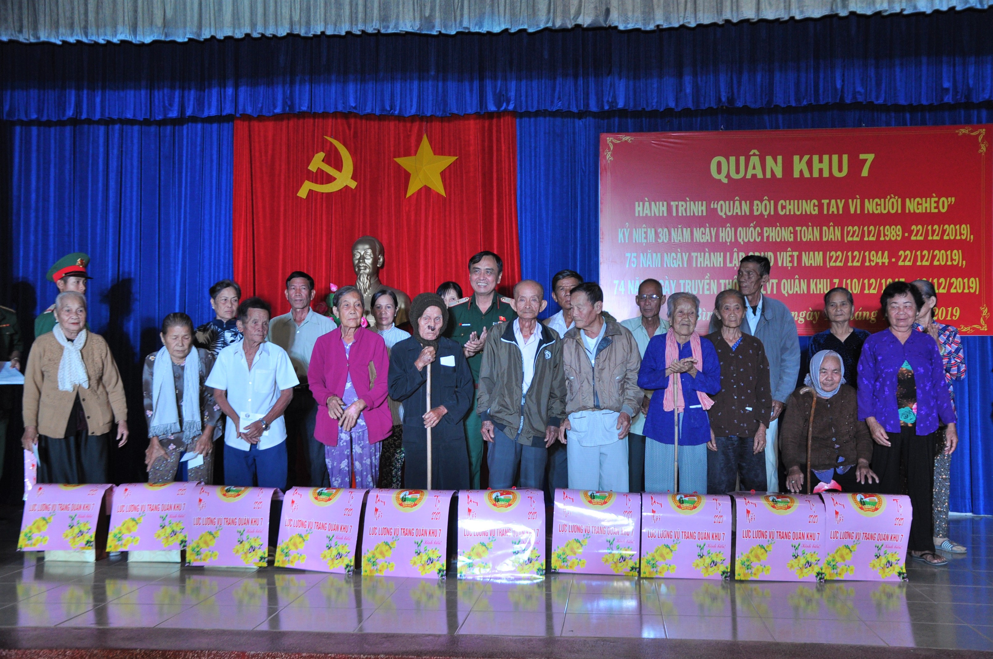 Thiếu tướng Nguyễn Minh Hoàng, Phó Chính uỷ Quân khu 7 tặng quà cho các gia đình chính sách khó khăn của xã Bình Hoà Nam.