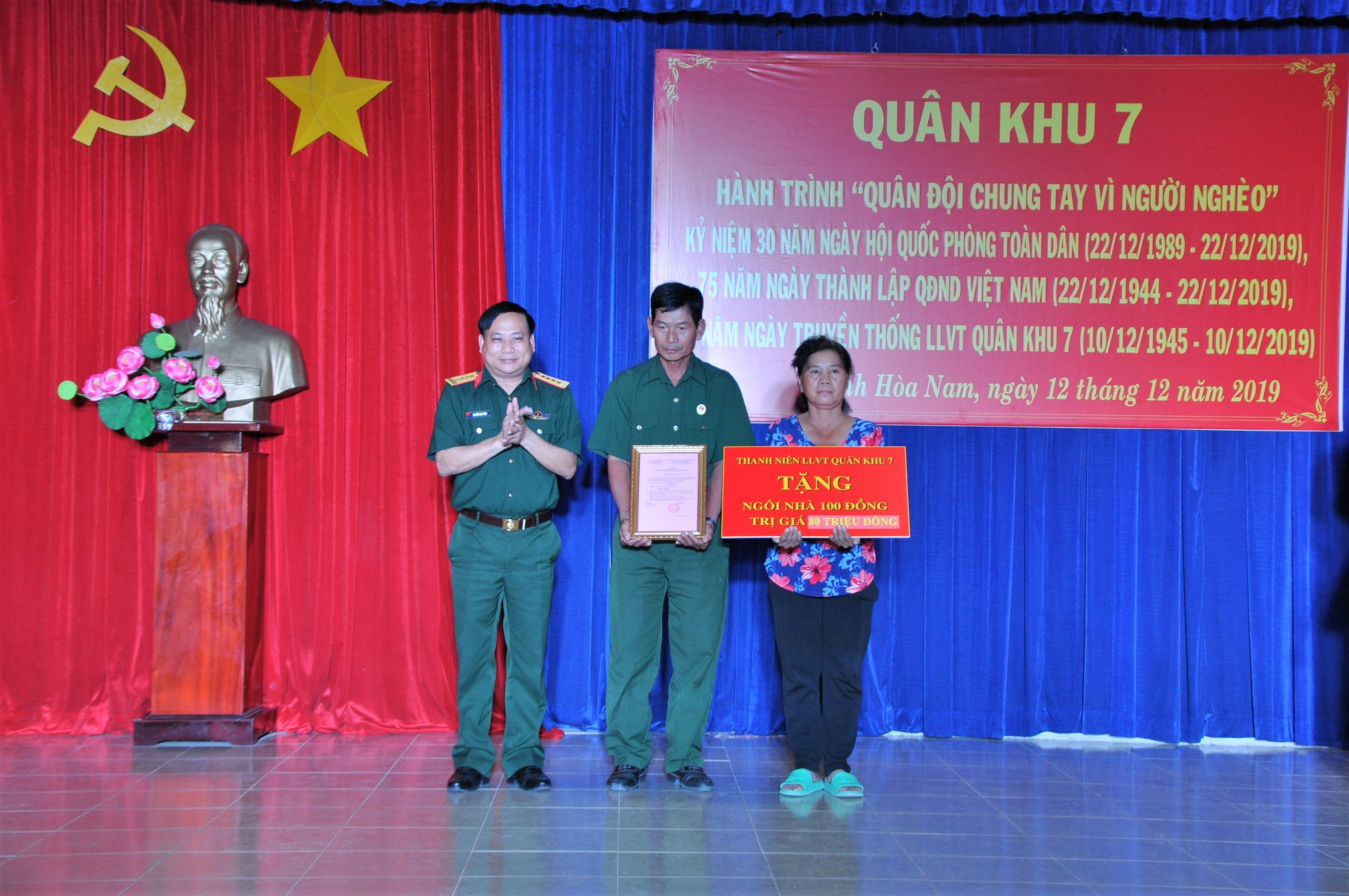 (QK7 Online) – Sáng ngày 12/12, tại xã Bình Hòa Nam, huyện Đức Huệ, tỉnh Long An, cán bộ đoàn viên, thanh niên, công đoàn, hội viên phụ nữ LLVT Quân khu 7 tổ chức về nguồn hành trình “Quân đội chung tay vì người nghèo” nhằm thiết thực chào mừng kỷ niệm 30 năm Ngày Hội Quốc phòng toàn dân (22/12/1989-22/12/2019), 75 năm Ngày thành lập Quân đội nhân dân Việt Nam (22/12/1944-22/12/2019) và 74 năm Ngày truyền thống LLVT Quân khu 7 (10/12/1945-10/12/2019).