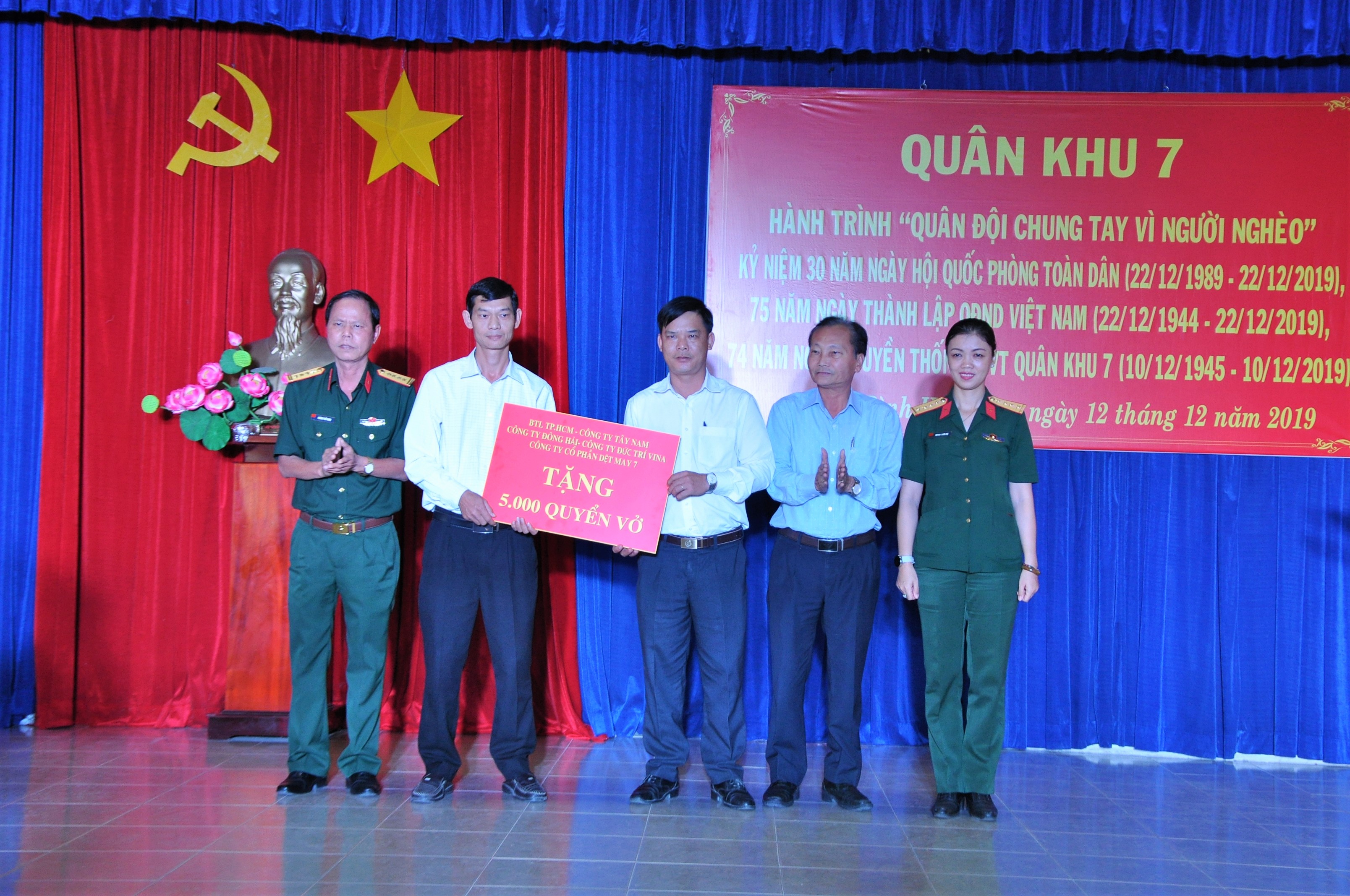 Đại diện Công ty Đông Hải, Công ty Tây Nam và Công ty Dệt may 7 tặng 5.000 quyển tập cho Trường THCS Bình Hoà và Trường Tiểu học Bình Hoà Nam.