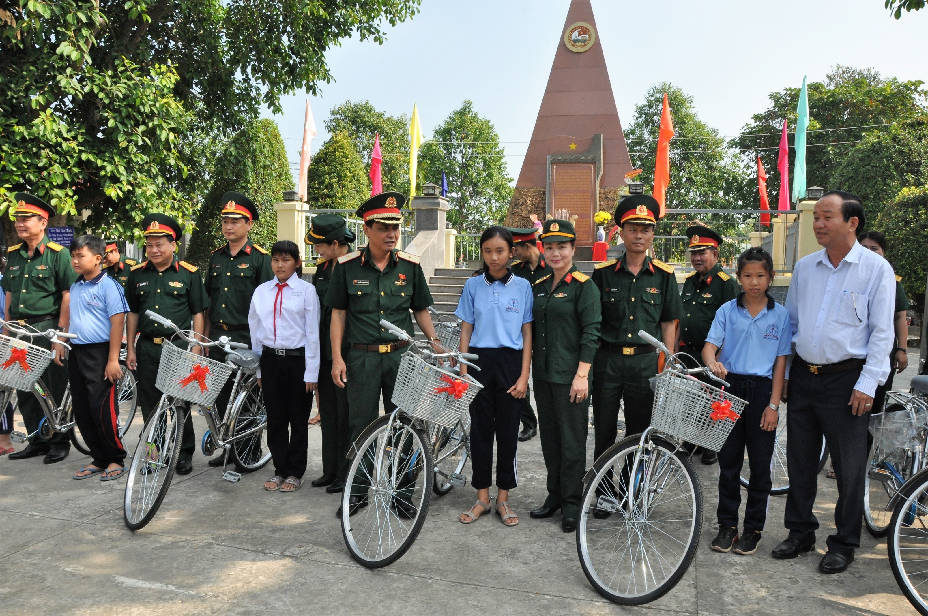 Thiếu tướng Nguyễn Minh Hoàng, Phó Chính uỷ Quân khu và lãnh đạo huyện Đức Huệ trao tặng xe đạp cho các em học sinh nghèo vượt khó học giỏi.