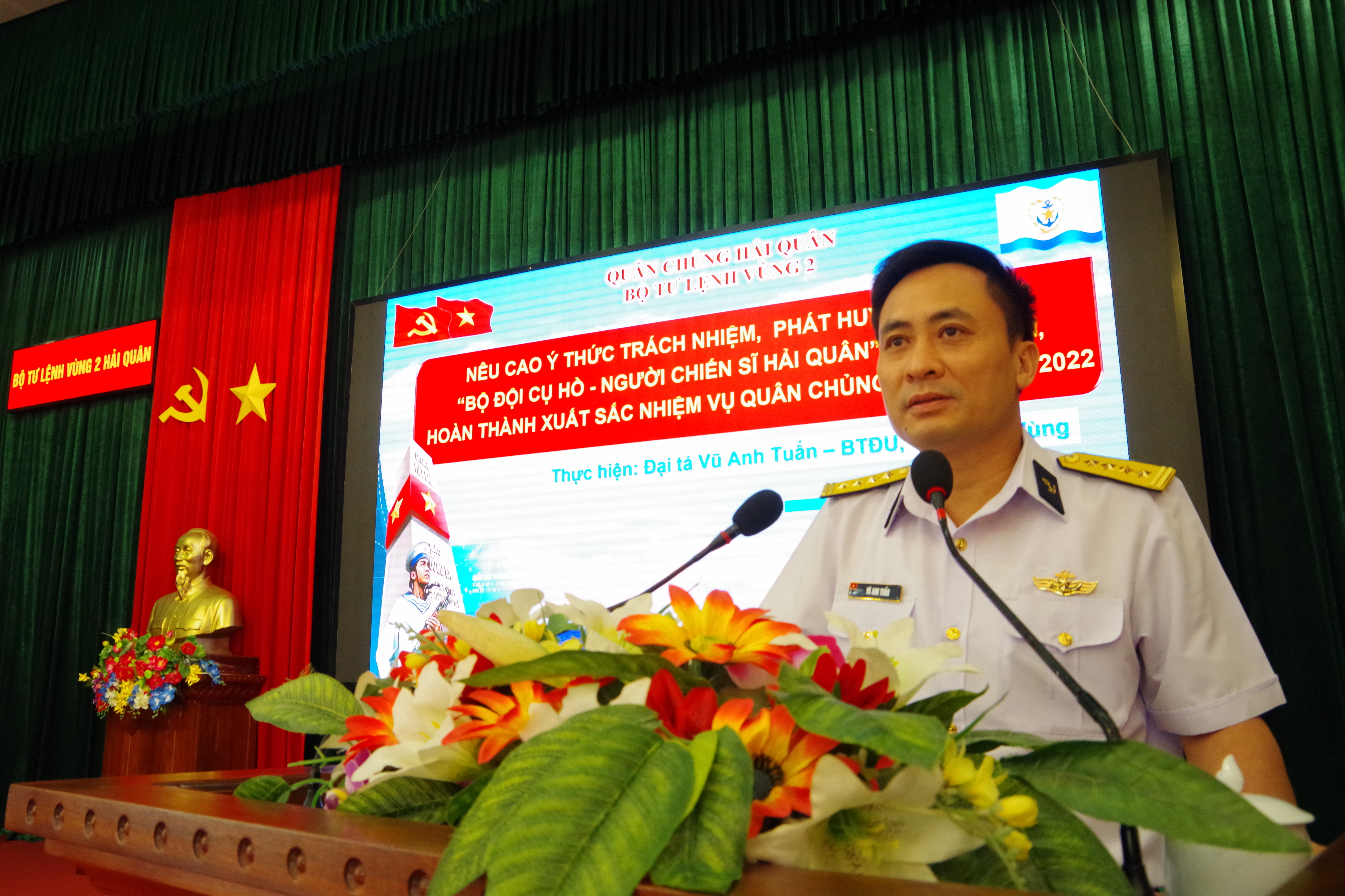 Đại tá Vũ Anh Tuấn, Bí thư Đảng ủy, Chính ủy Vùng 2 trực tiếp quán triệt, triển khai nhiệm vụ. Dự hội nghị có các đồng chí là cấp ủy viên các cấp, cán bộ chủ trì các cơ quan, đơn vị trực thuộc Vùng 2 và hơn 180 cán bộ, đảng viên tại Căn cứ Long Sơn.